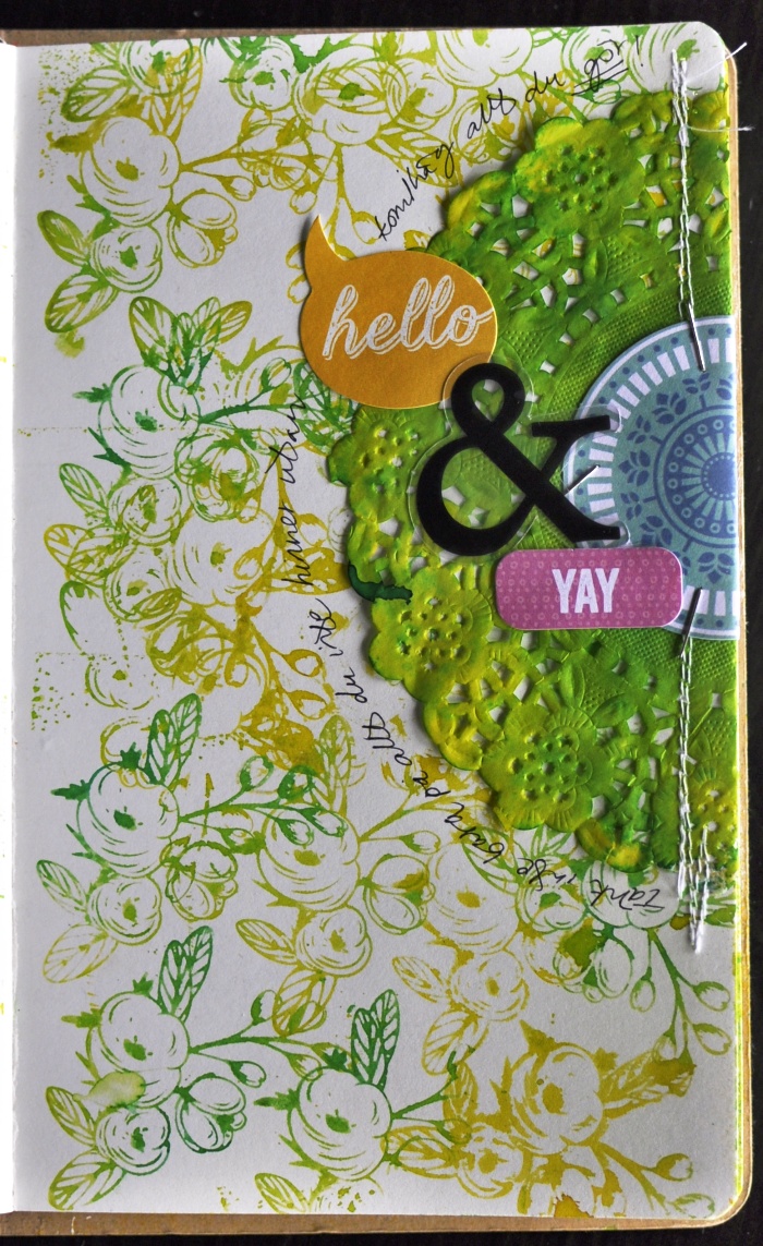 On top of the stamped page I added the doily, using my sewing machine.