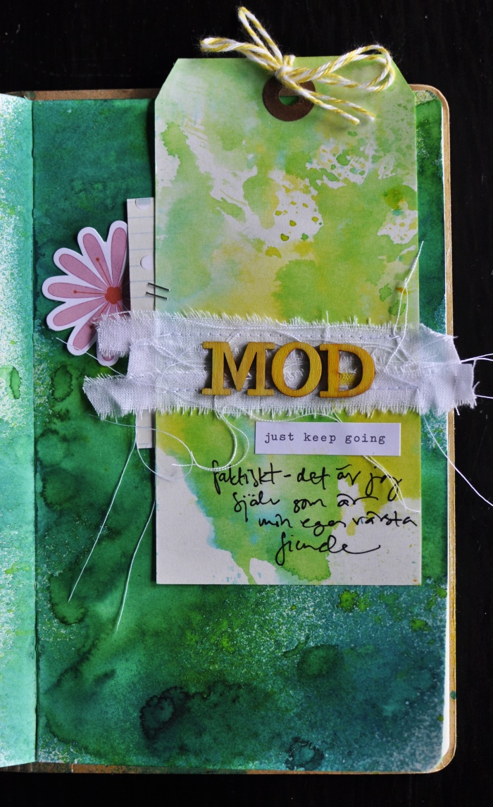 And for my third page I added some fabric strips to the coloured shipping tag. “MOD” means COURAGE.