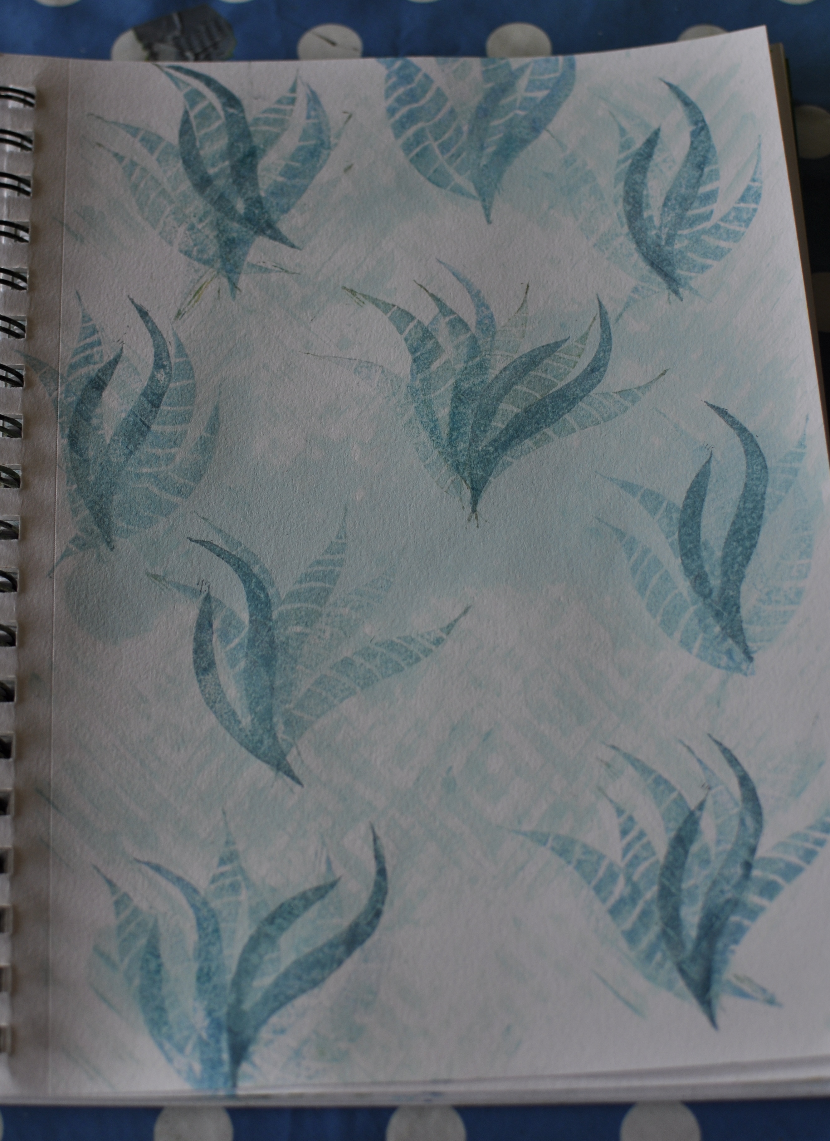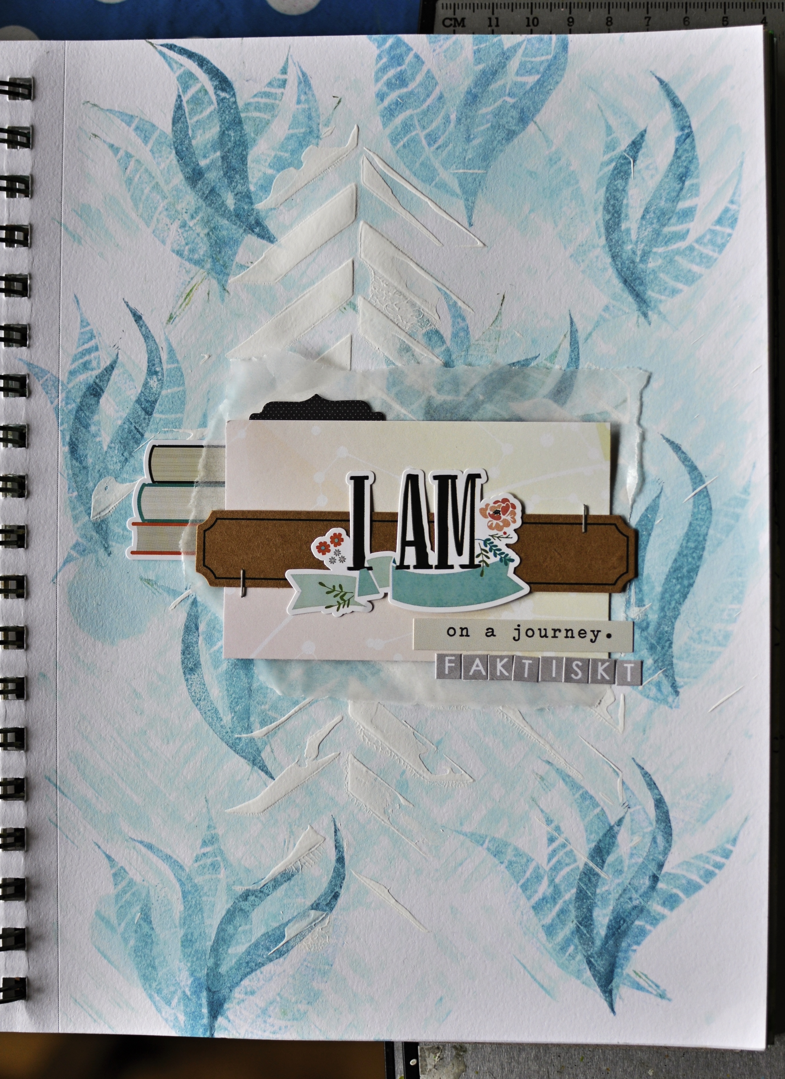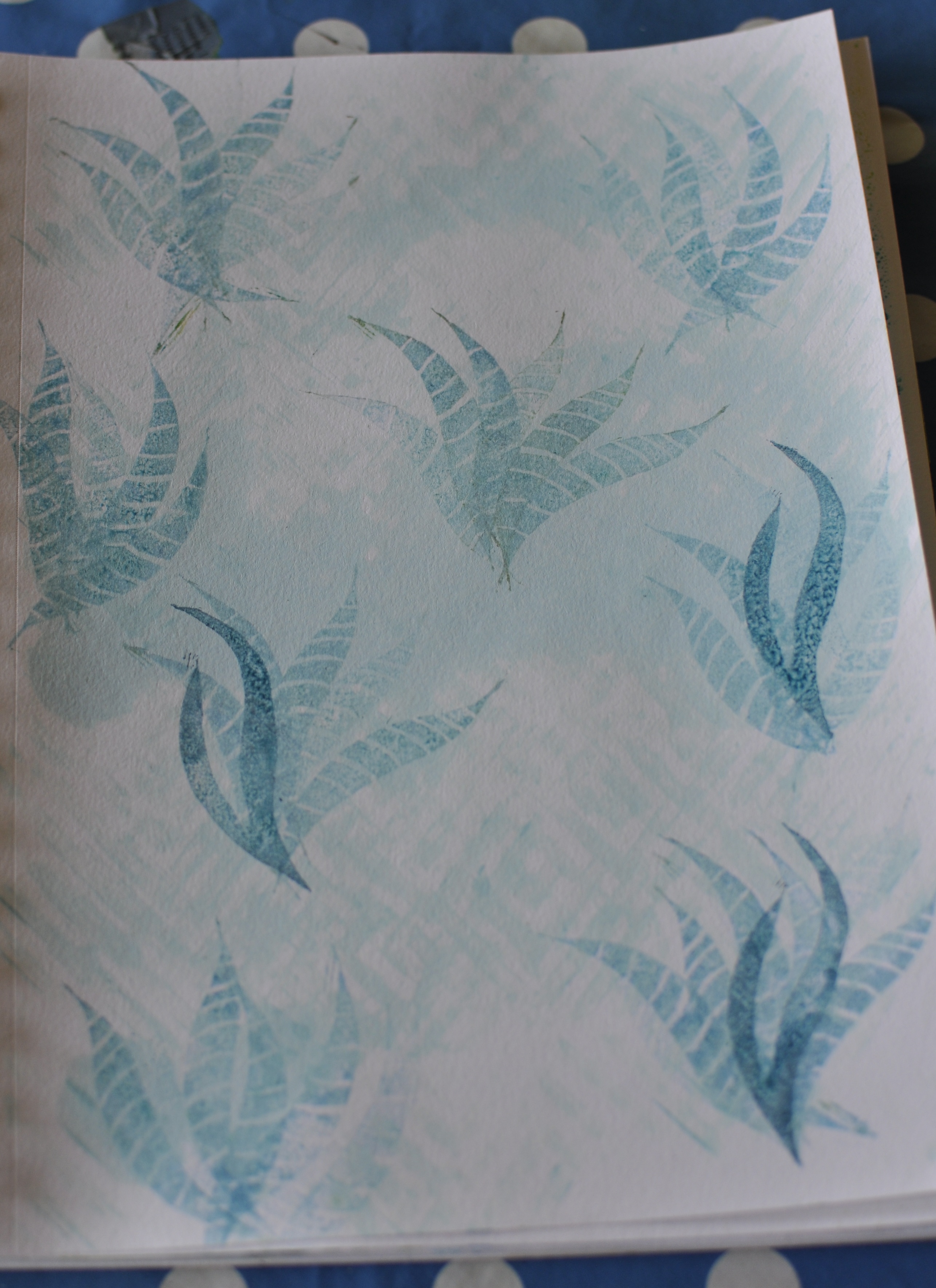 For my second page I used two different stamps and two different blue inks when stamping and I stamped onto a page where I had previously added some light blue paint.