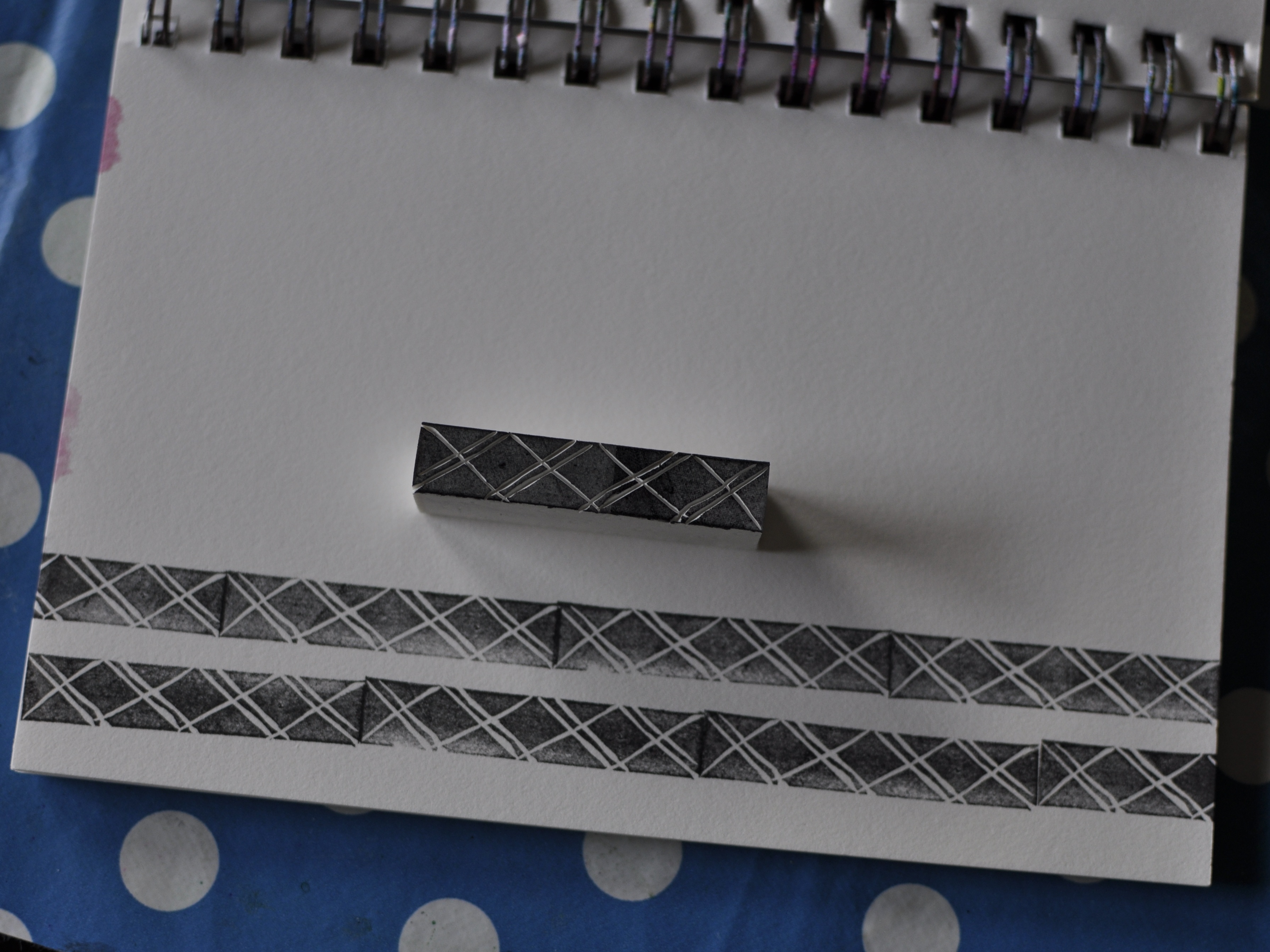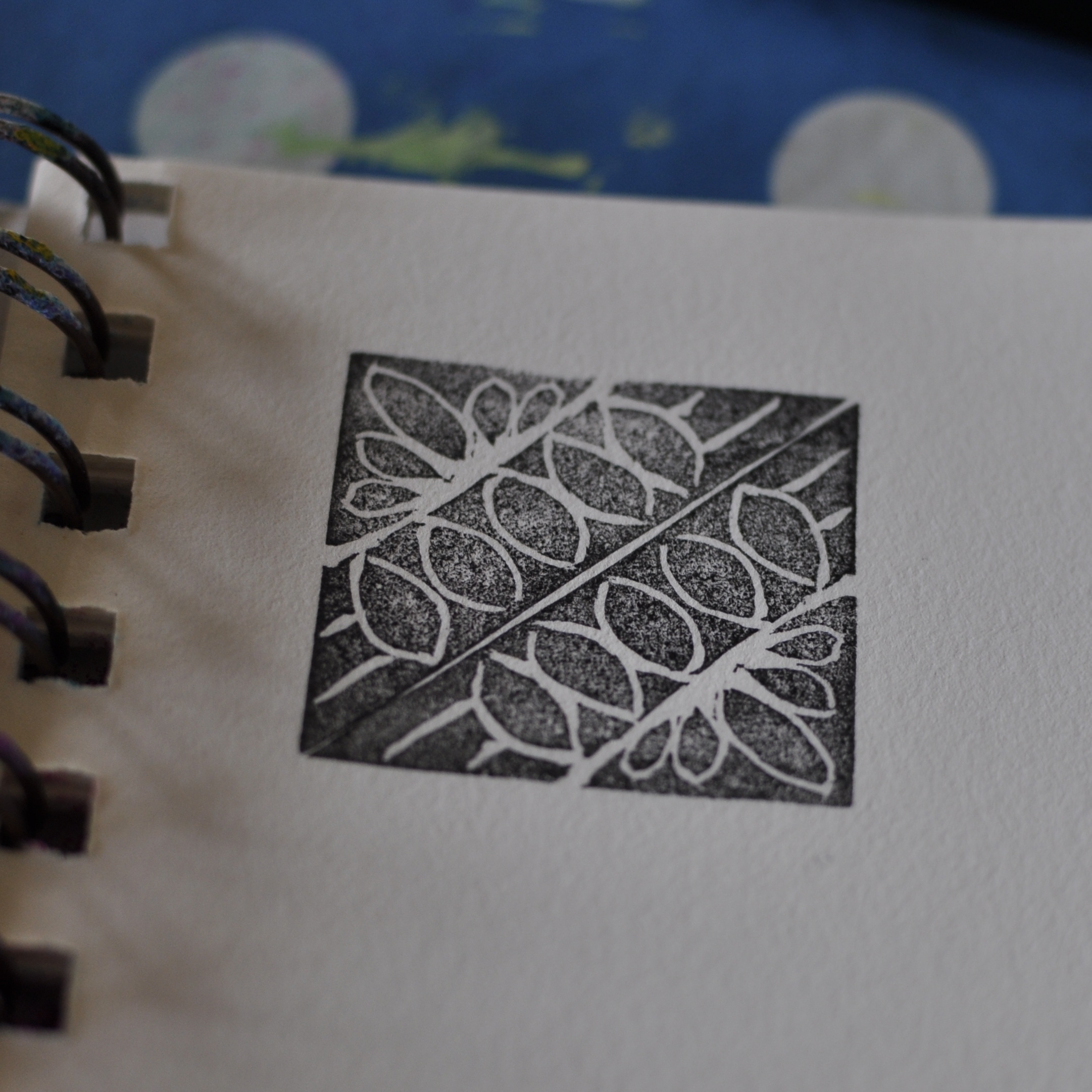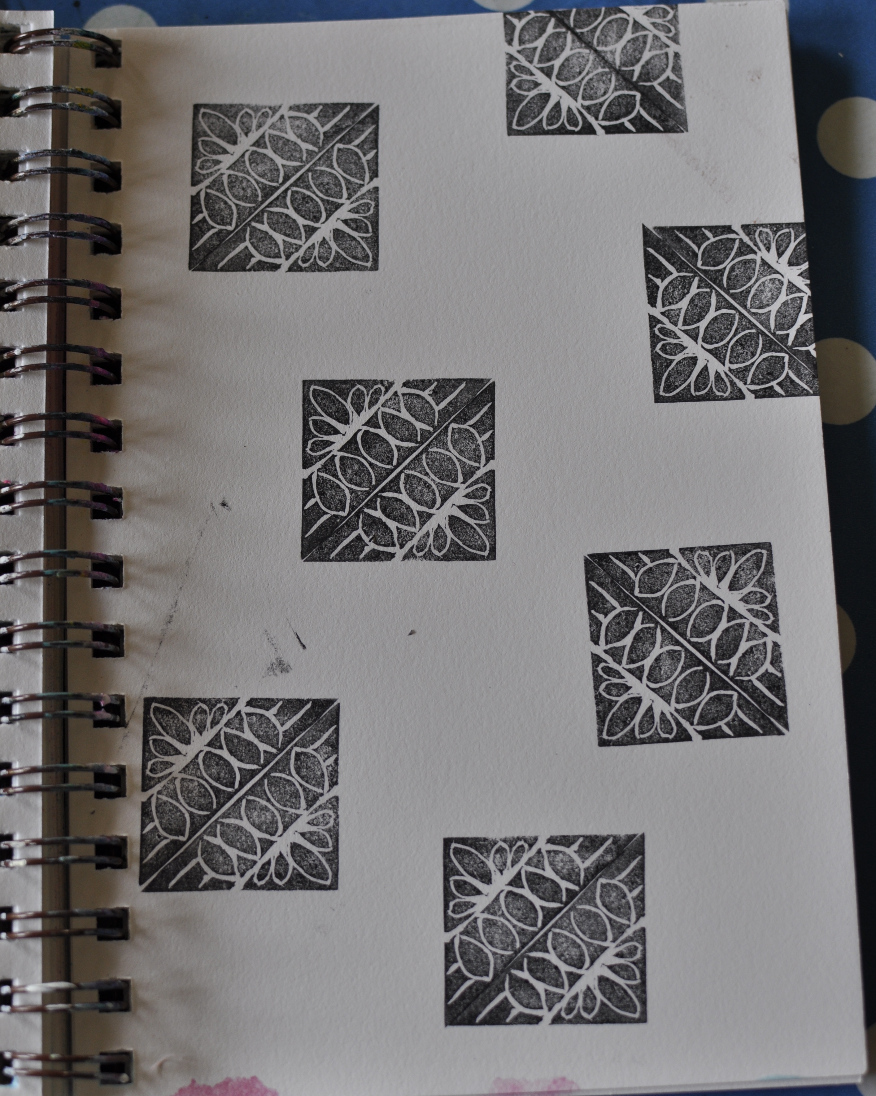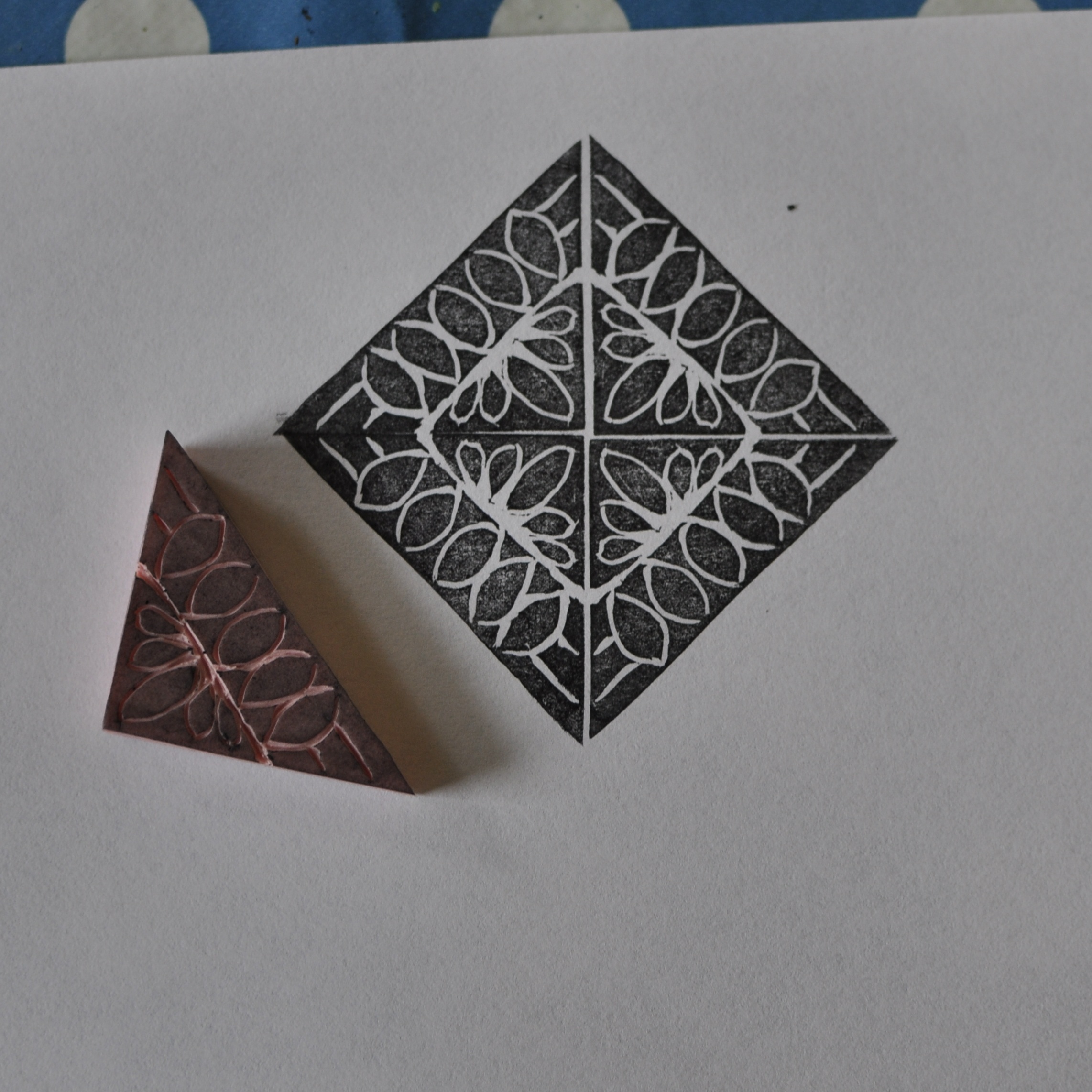 It can be combined to a square by stamping twice like this… (and a tip: when you ink your stamp it’s easier to see what you’ve missed when carving. You can go back and clean up areas where there is too much rubber left etc.)