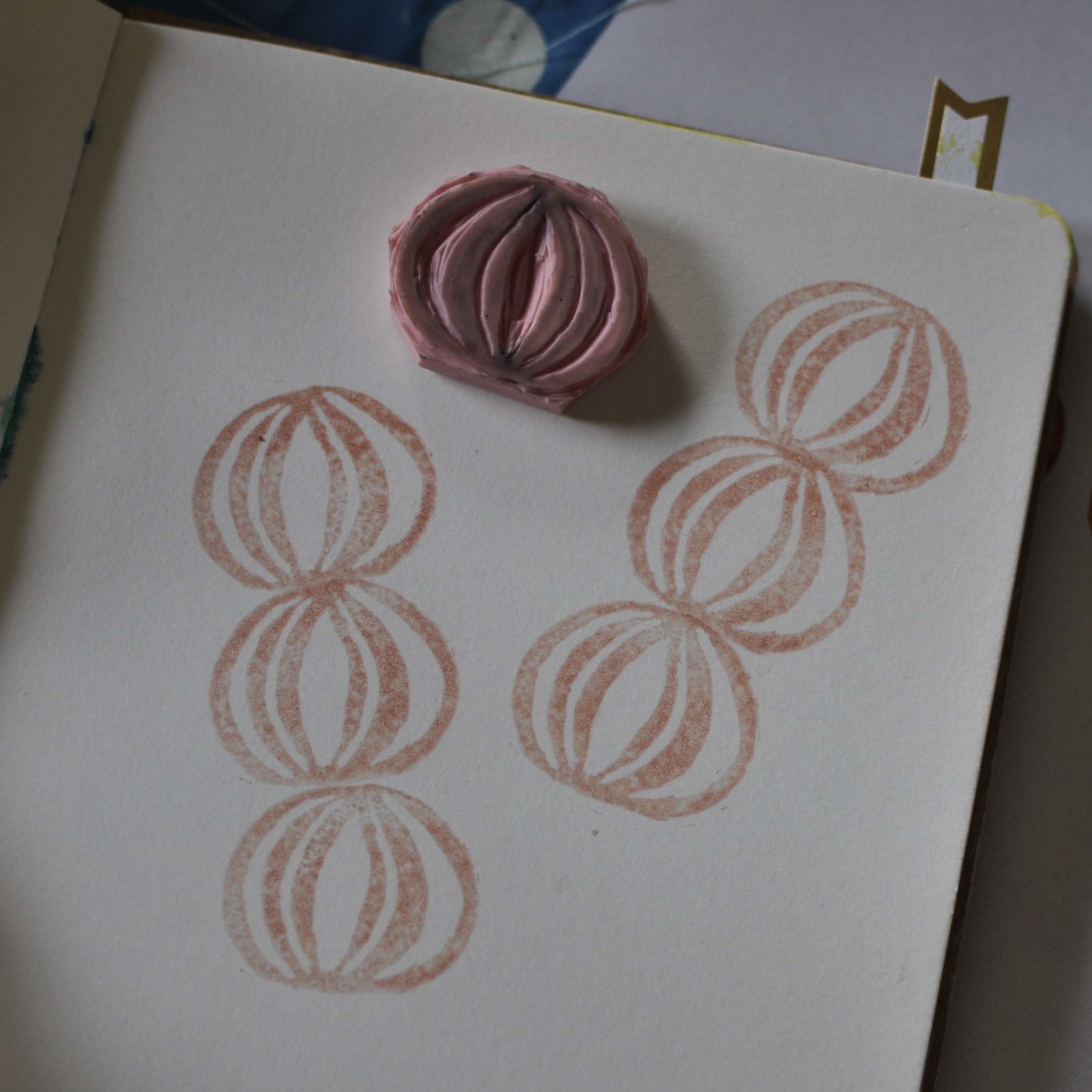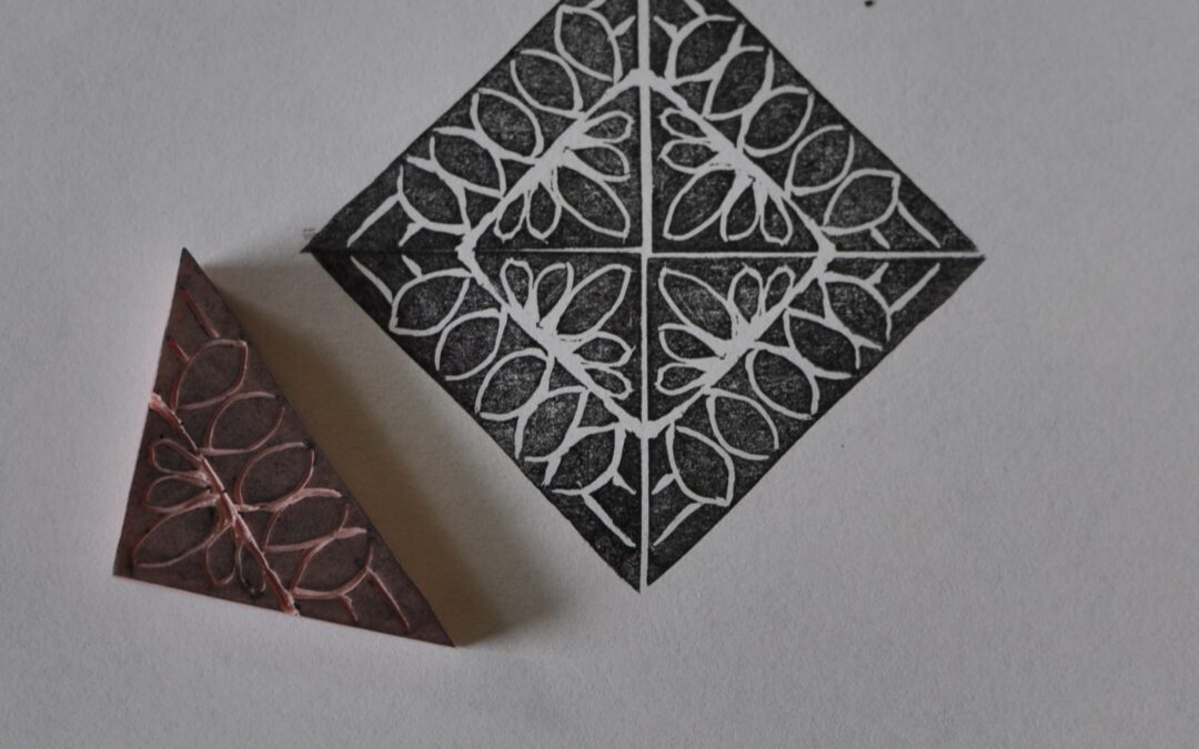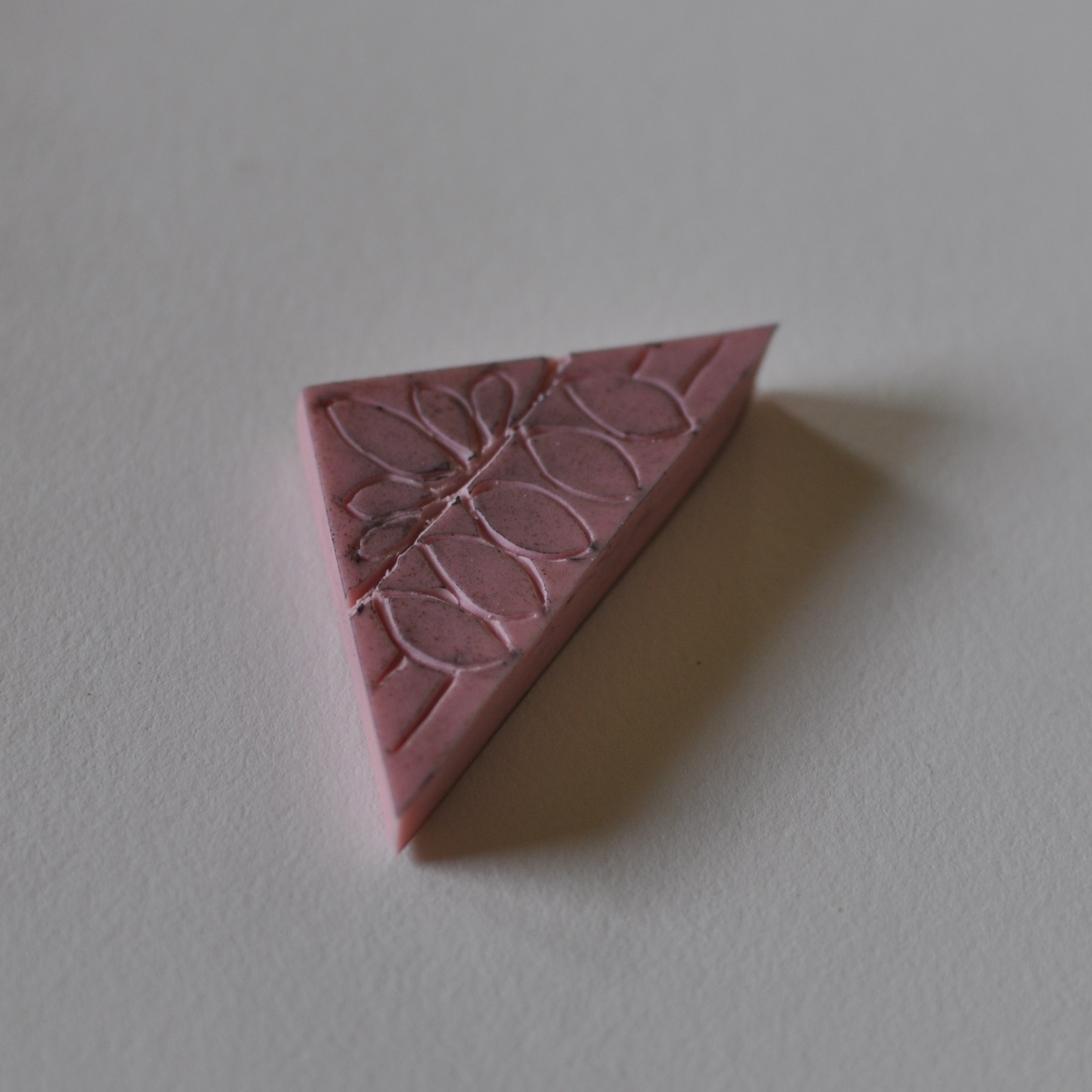 I started out with sketching, trying to come up with a design that I liked. I decided to create a triangle shaped stamp and I cut a piece of the pink rubber and drew a design in the same size on paper, using a soft pencil. I then transfered the design to the rubber by pressing the paper against the rubber and… rubbing! It’s then easy to fill in the lines with some more pencil, if necessary.
