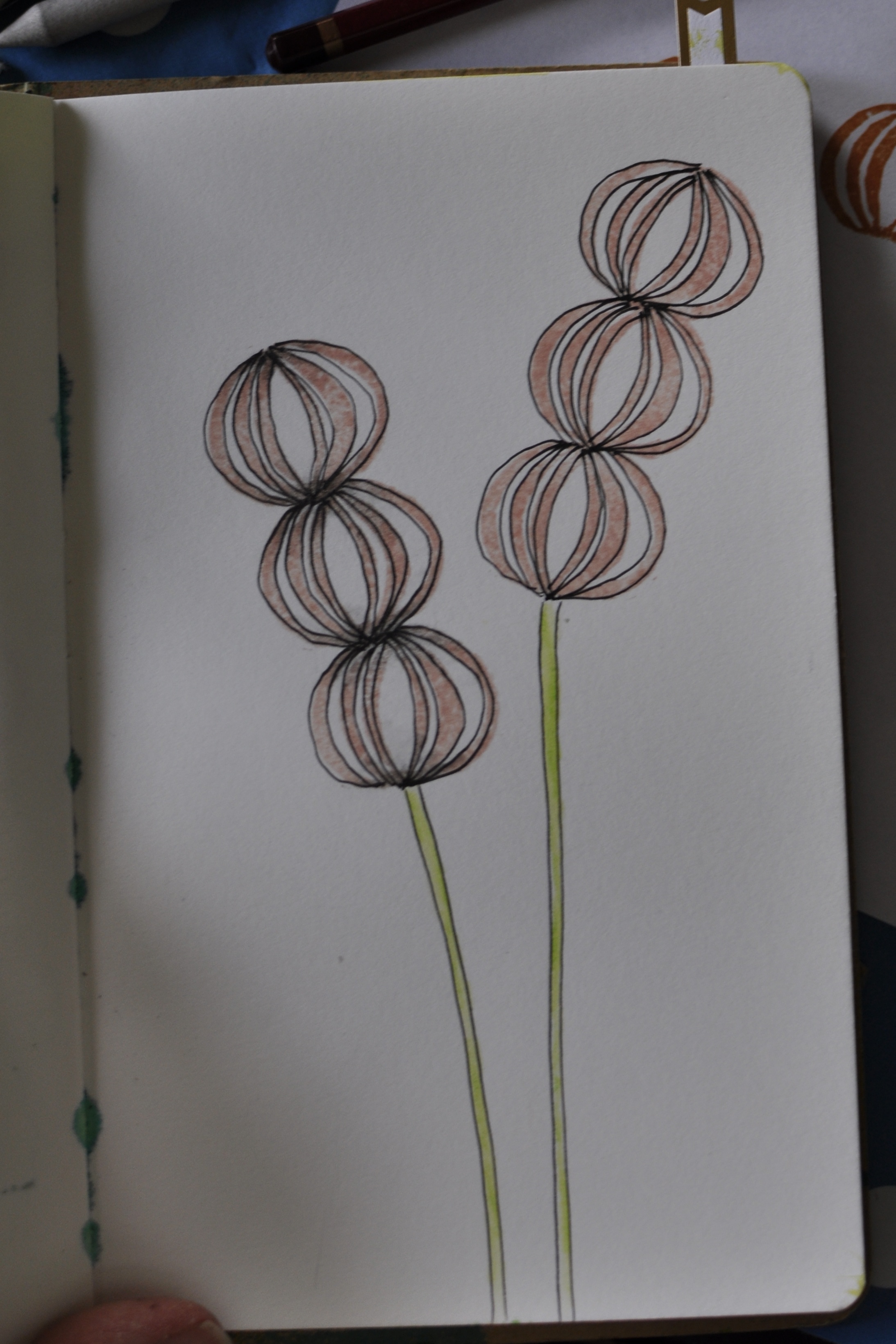 I then added some doodling with a black pen (from the April Project Art kit). I also added some shading using a pencil. Here you can see the shading on the left, but not on the right.