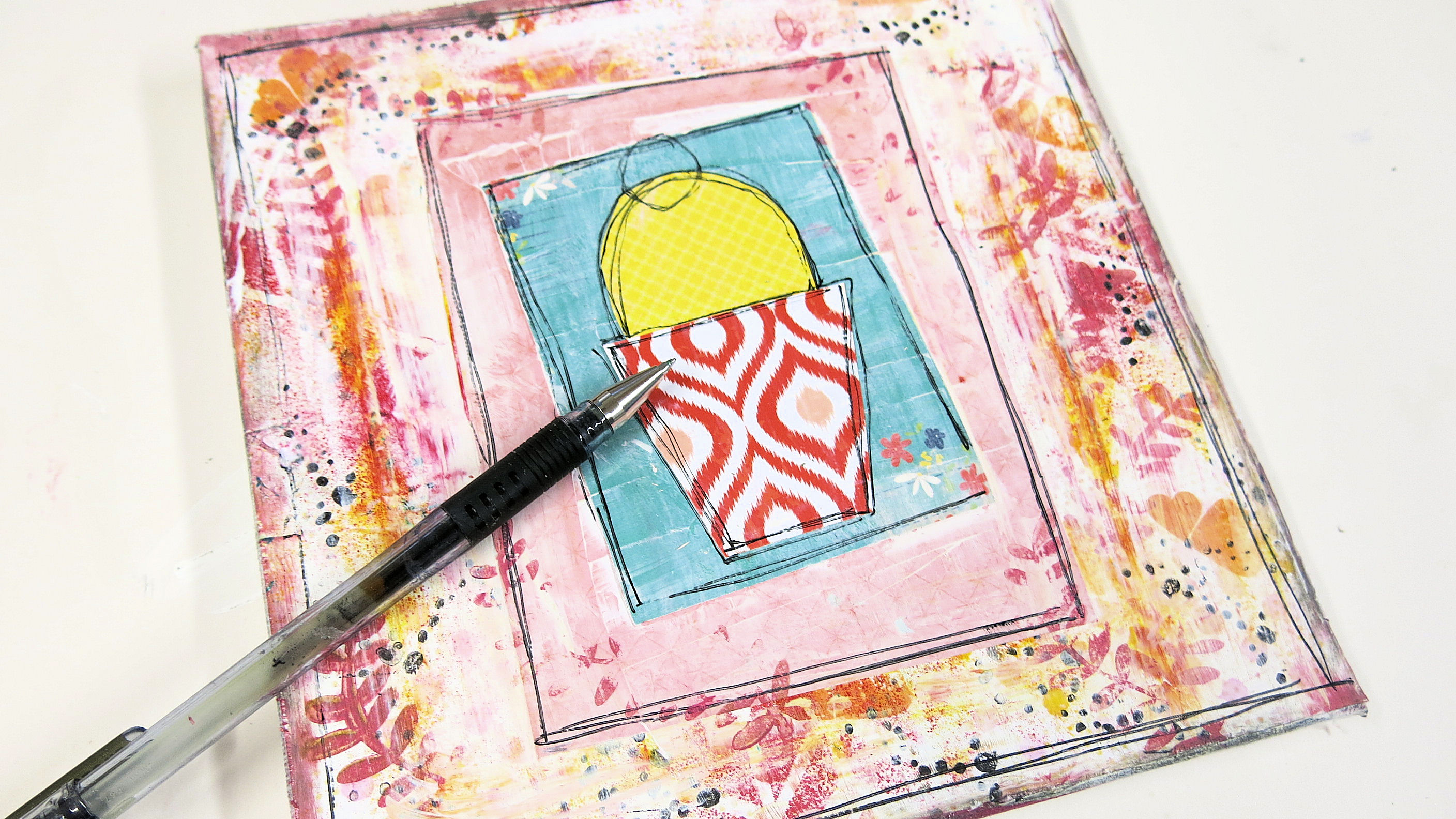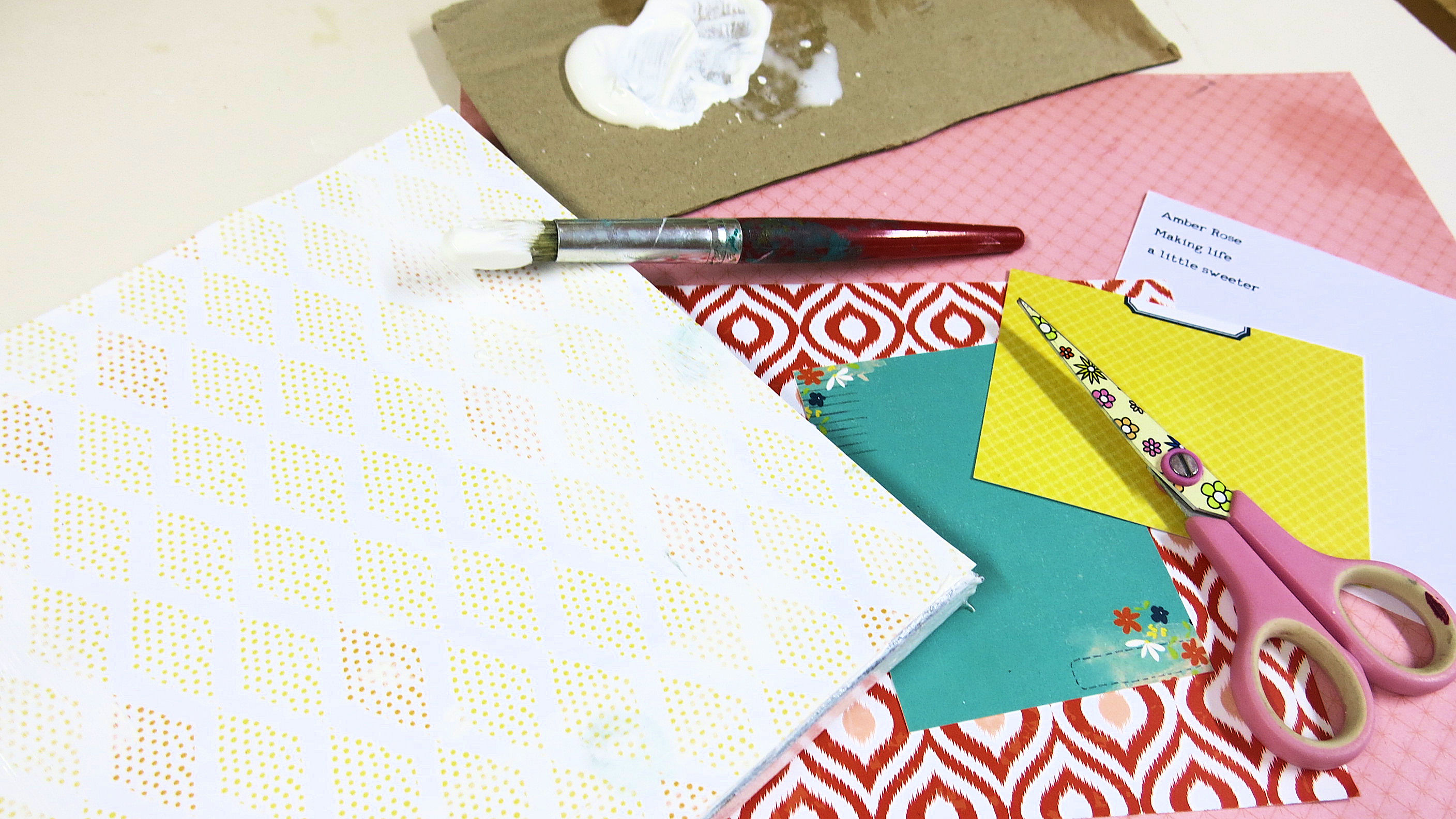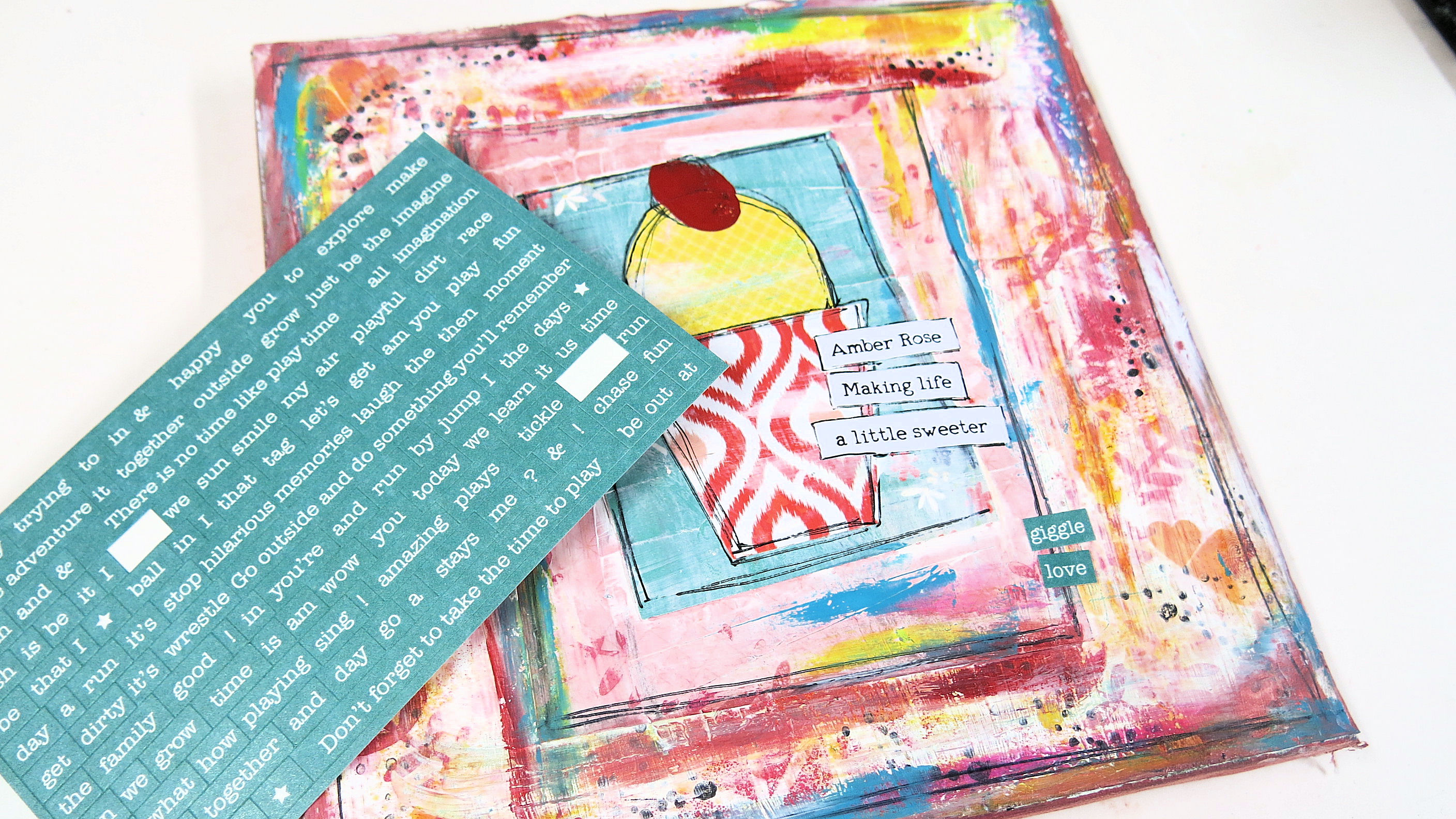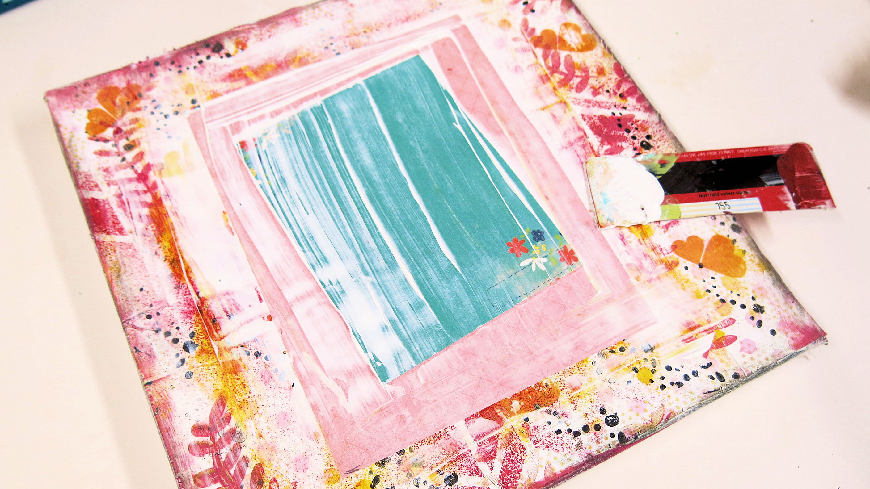 I take some more patterned paper and a DITL journal card and place them in the centre of my canvas. Once stuck in place with regular pva glue, I take an old credit card and spread white acrylic paint over the papers.