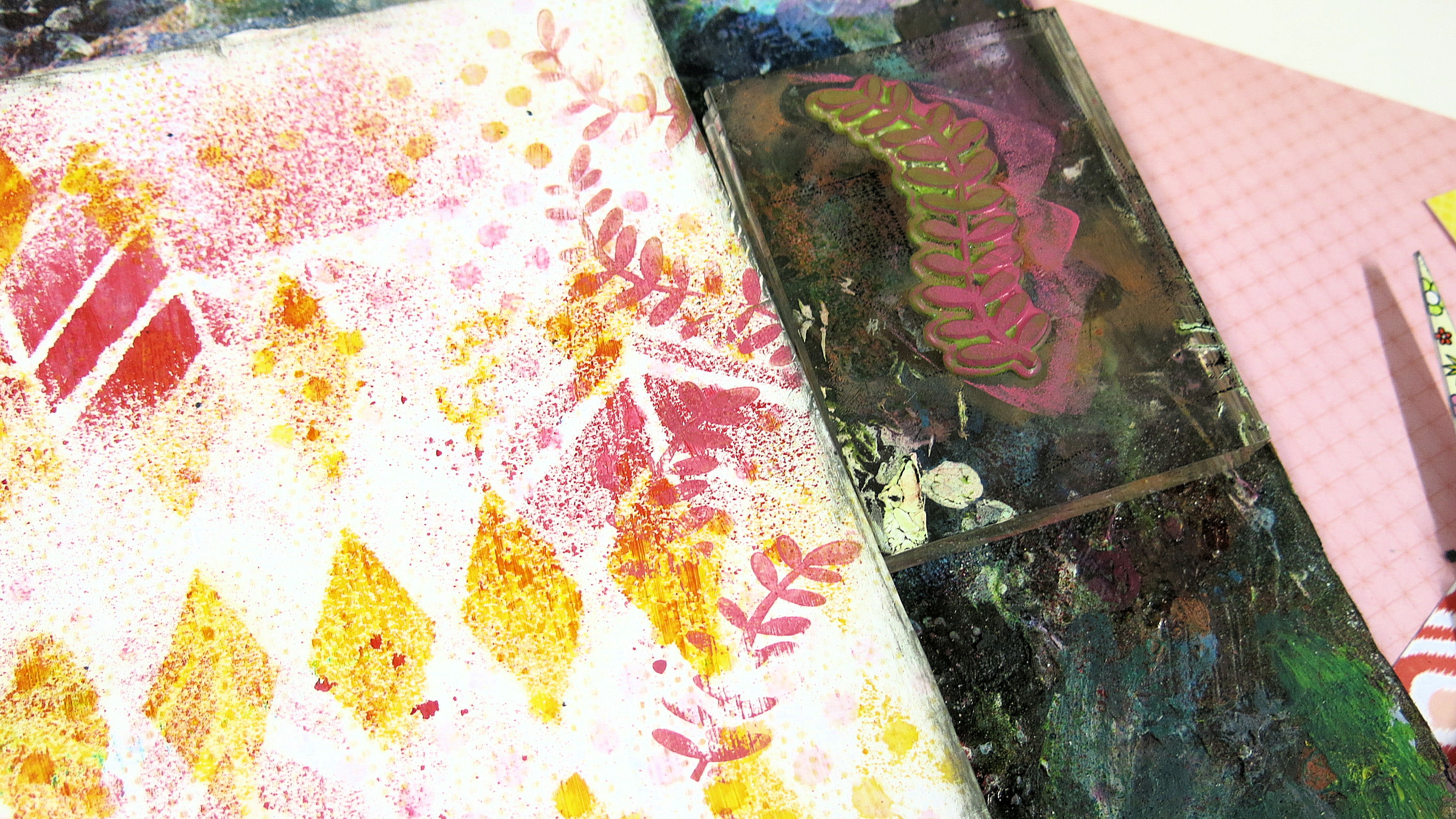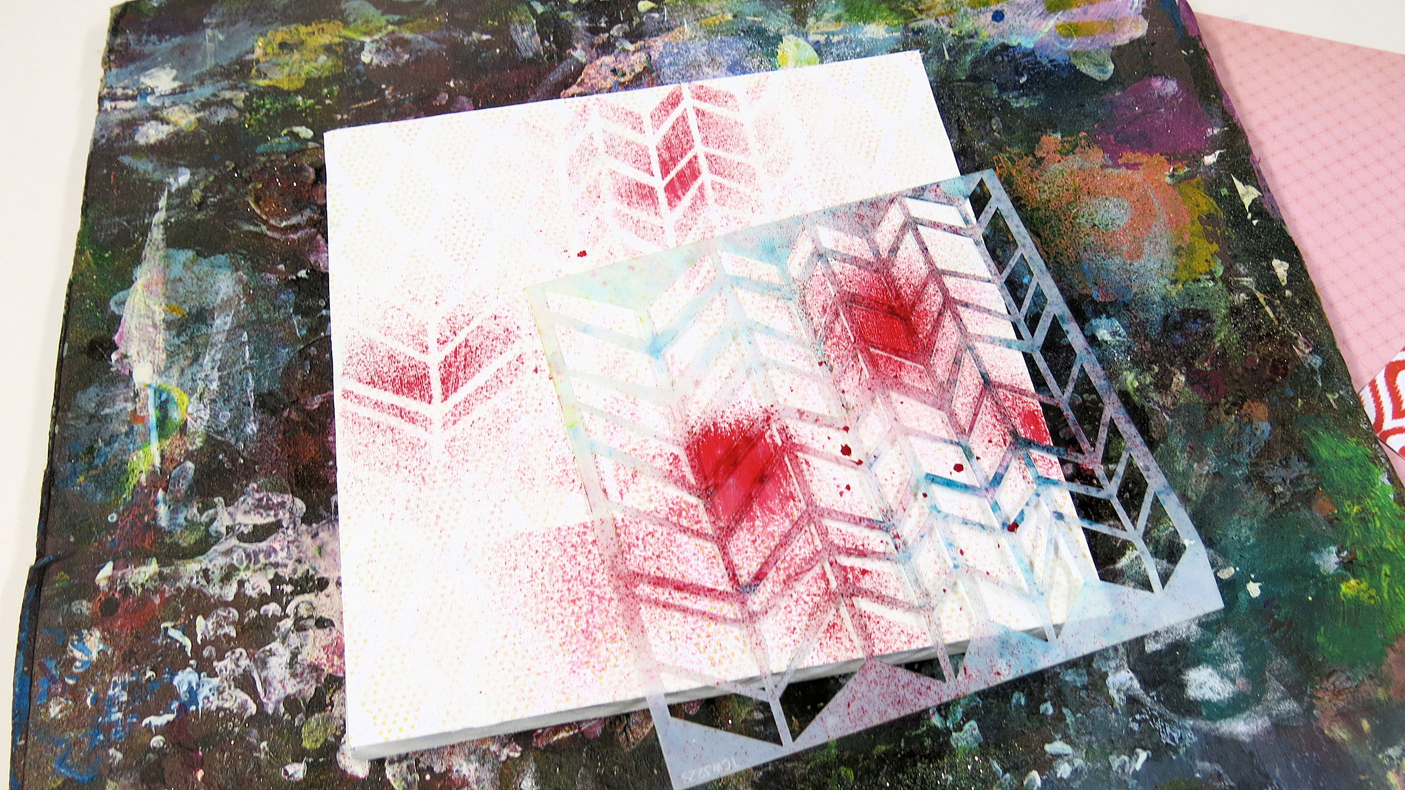 Once dry (I like to use a heat gun to speed up that process) I then used a couple of stencils and mists.