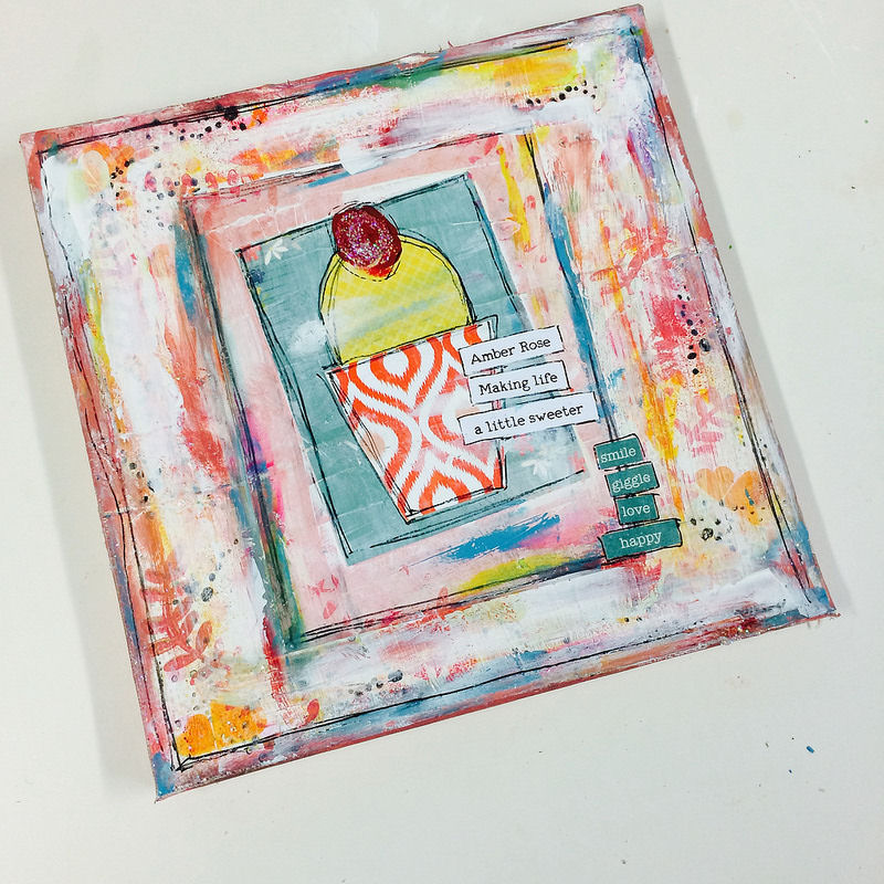 I started with a square canvas and some Cocoa Daisy papers. I cut a large enough piece of the patterned paper to cover the front of the canvas and then painted the whole piece with gesso.