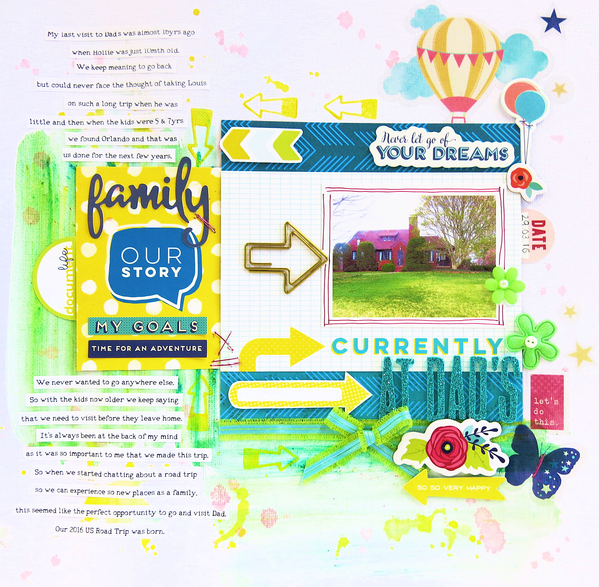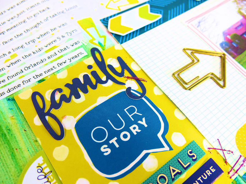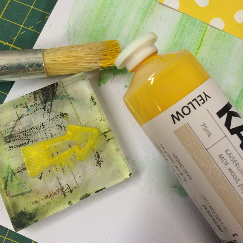 I’d already made the LO though and then remembered the stamps. I really wanted to use one of the arrows, but I wanted to stamp in yellow but needed it to be bright enough to really stand out and not get lost. My ink pad just wasn’t good enough, so I decided to try paint.