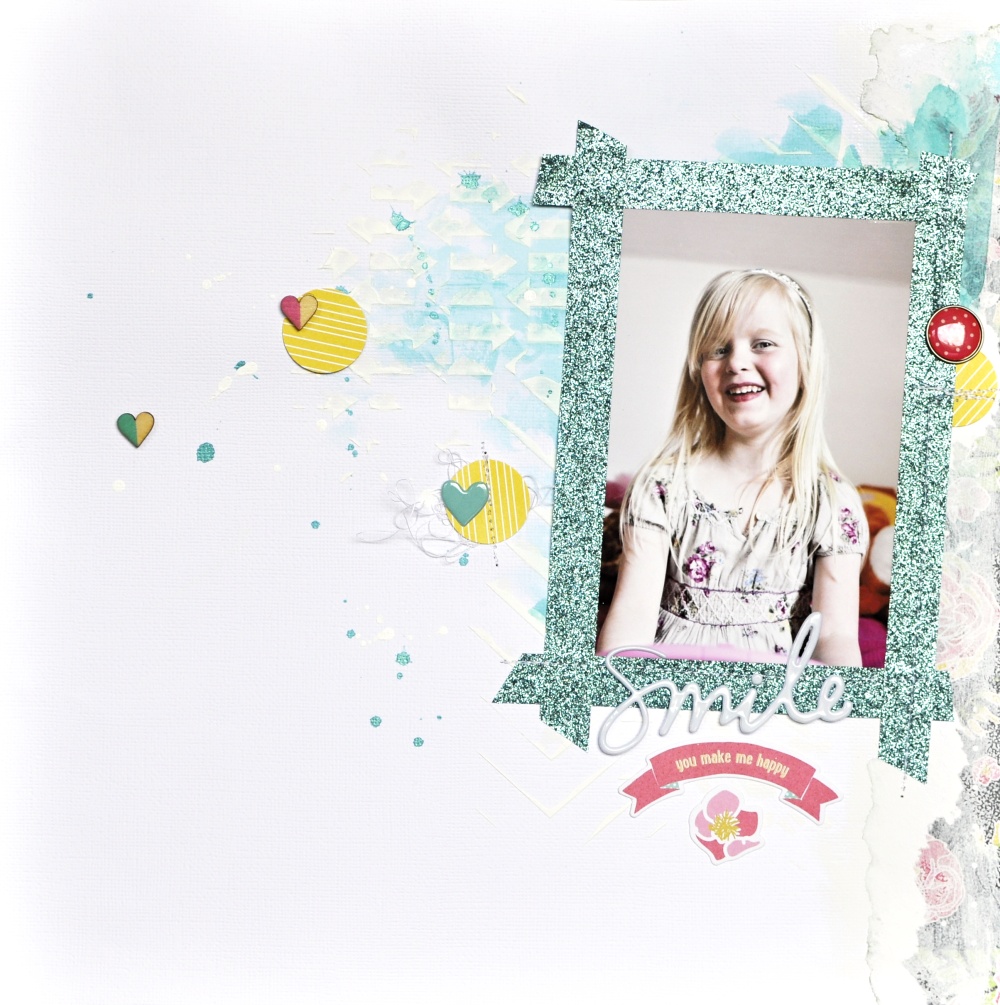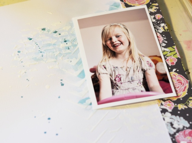 Anna, can’t tell you how much I love your layout (texture, paint, splats, embellies and overall design). Thank you making it real, how you fixed the issue and ended up with this fabulous lo. Love how the floral paper recedes into the background and adds to the overall effect.
