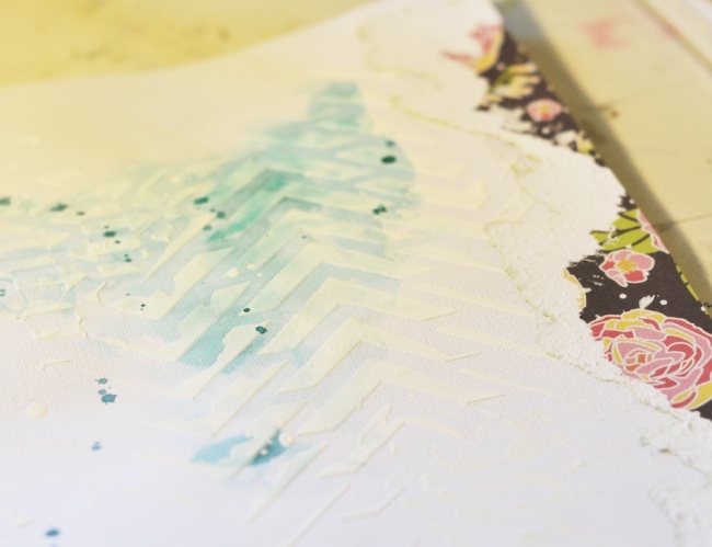 I added some gesso to the background, using two different stencils. After drying the gesso with my heat gun I added some blue mist.
