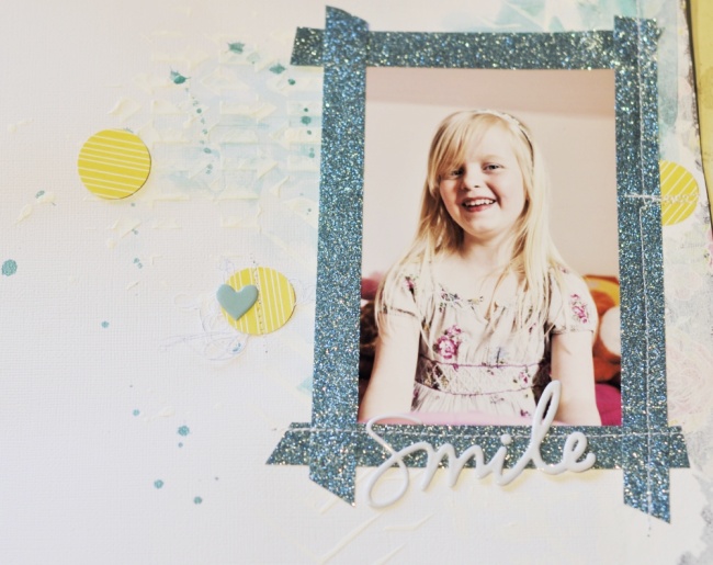 To finish my layout I added some stitching along the tape and over a couple of the circles. I also added the “smile” and some other small embellishments.