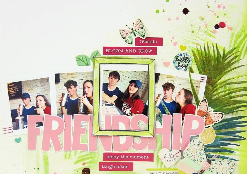 I made it using the March Kit. I like it for a few reasons. Firstly, the fact that my teens are such great friends. Watching them mess around together always makes me smile. There is a genuine friendship there and there always has been. Now from a design perspective, I ended up using a patterned paper that when I opened the kit was my least favourite and I never expected to use. I ended up cutting out the huge leaf and using it as a stencil and then also using it on my page. It was a really fun page to create, one that I completely lost myself in. And crazy to think that when I opened the kit, I stuck it to the back expecting not to use it. One of the many reasons why I love my monthly kit!!