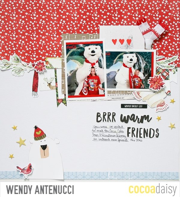 I’ve finally narrowed it down to this layout from the November 2017 kit, I just love the splash of red with the white, the bear is just so cute, and all those pieces make my heart go pitter-patter!