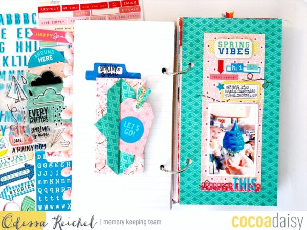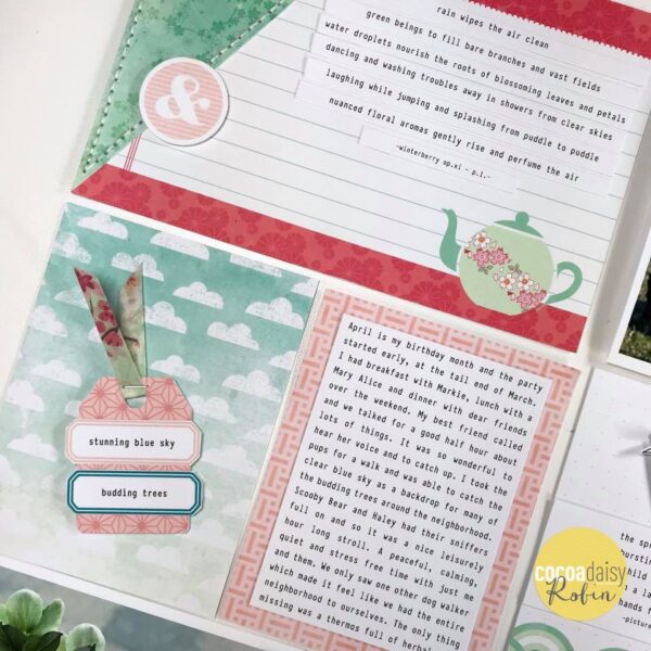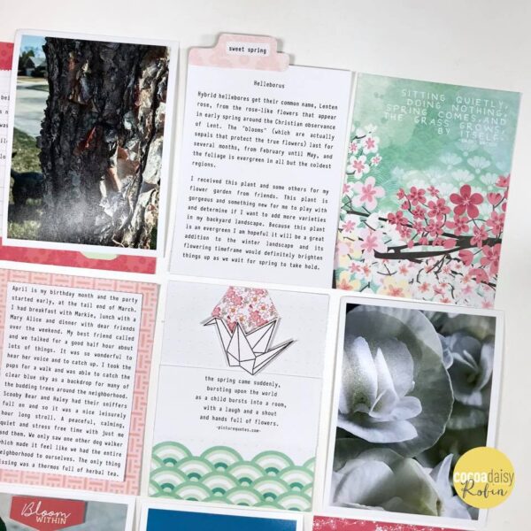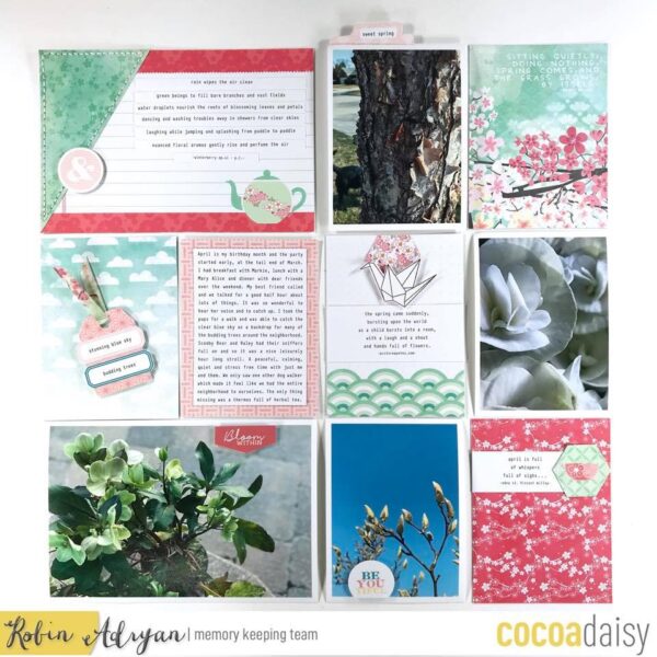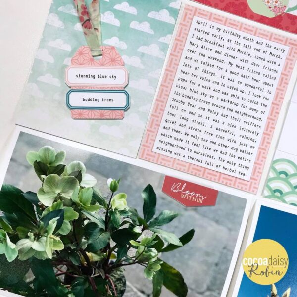 She explains her page like this: ” I created this layout with the memory keeping printable. I really liked the printable ephemera with the bluish green color and used them to add a bit of pop to the overall green and light pink scheme. I also fussy cut some hexagons and added a crane stamped and cut out to highlight the idea of spring arriving.