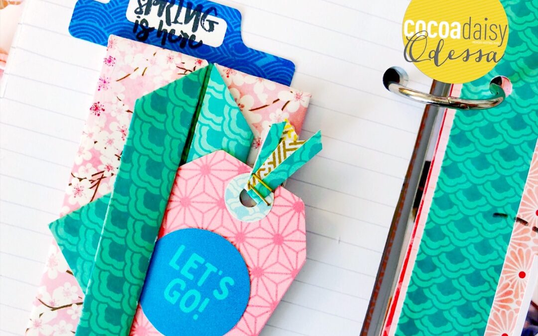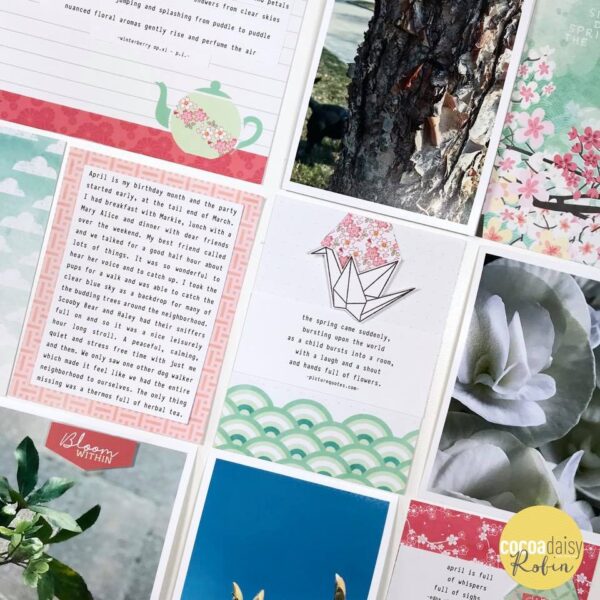 Here is my latest Traveler’s Notebook layout usually song the Cherish Blossom kits. I got really inspired by the origami paper this month in the Classified Memory Keeping and ended up folding a bunch of paper before I sat down to make this page. As a kid I looooved origami so I dug out some instruction books and got a little carried away. I got inspired and folded a little pocket out of one of the papers (here are some similar instructions I found online if you’re interested) from the Traveler’s Notebook kit. I tucked a little tag cut out from the printables and added a cute circle to the tag, also from the printables. Then I threaded some paper and washi strips though the hole in the tag and glued it down to my page. I added a tab from the printables that I stamped on using a stamp, also from the Traveler’s Notebook kit. The blush and warm reds contrast so well with the blue-greens in the kits, its such a good colour combination!