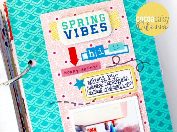 On the other side of the page I cut down the same paper I had used for the envelope for my background. I layered some more paper on top to bring focus to my photo. I added a journalling cluster on top using chipboard, washi, printables, stickers and stamps from various Cherish Blossom kits to get some words down on my page.