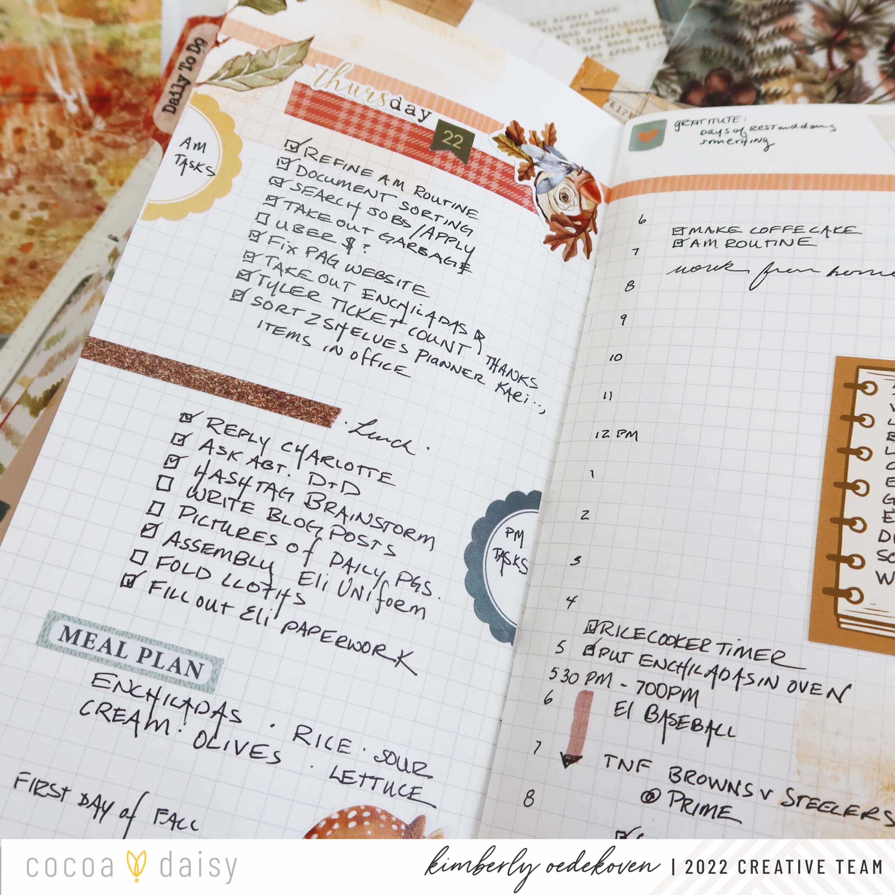 I tend to love a day on two pages. Enough to play and plan at the same time. I loved decorating with all the beautiful die cuts and stickers from the Autumn Thicket Collection but I also want enough room for time blocking, to-do lists, gratitude, and meal planning. Of course, you can make it your own with whatever sections you need on a particular day.