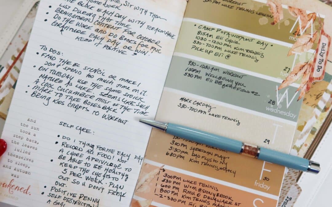 Starting with a vertical Daily page with time on one side and a to-do list on the other. This is a classic and very routine way of planning your day. I did take the sticky note that was given to us in the Autumn Thicket Planner Kit, removed the top and placed part of it in the header section, and adhered the remainder of it as a checkoff list. Simple, effective, and easy way to time block for your most efficient of days.