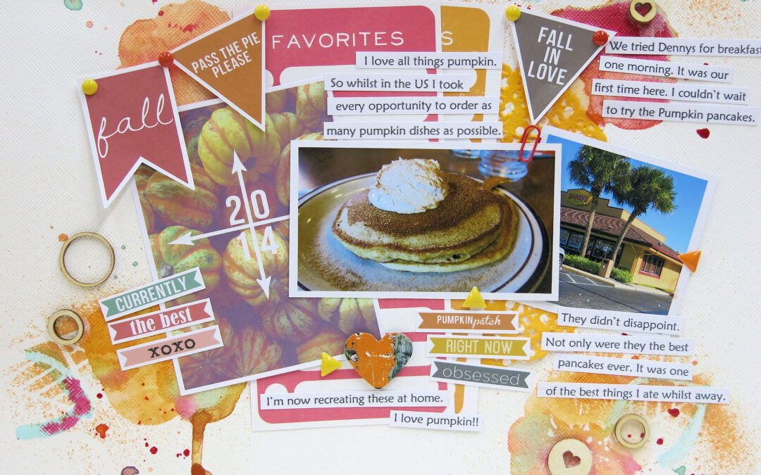 The pumpkins really called out to me this month. I really love that pumpkin card with 2014 on it. I completely over indulged in pumpkin goodness whilst in the US last month, so it was time to tell that story using my Weathervane Kit.