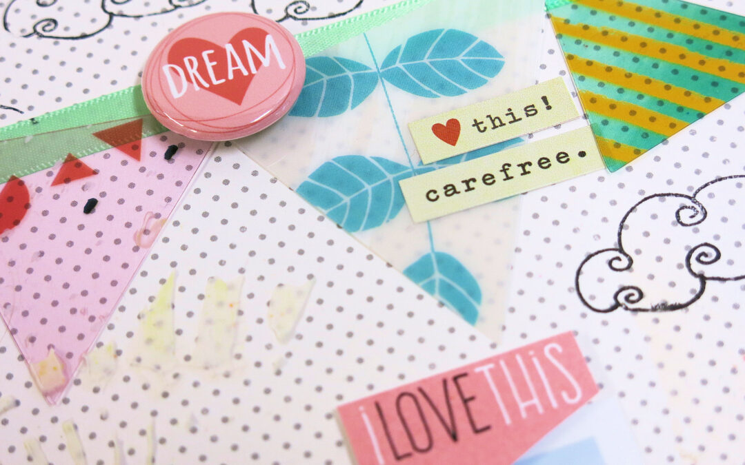 Anyway…When I saw these cute acetate triangles that come in the Main September Kit I knew instantly that I wanted to use them to create bunting on my first September Kit LO. They come as a pack from Pink Fresh Studios and I LOVE them.
