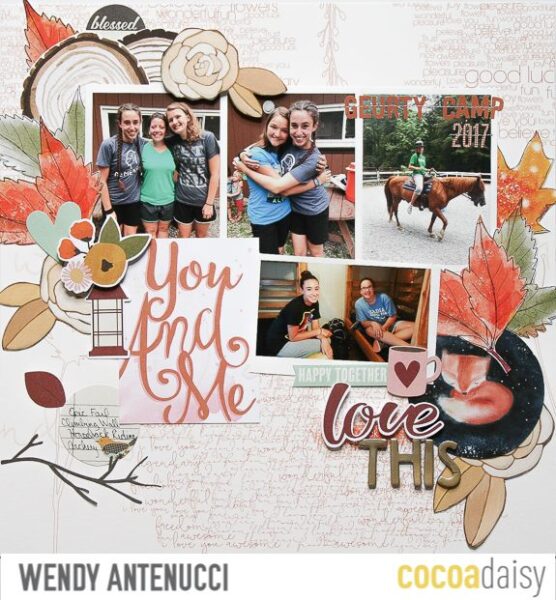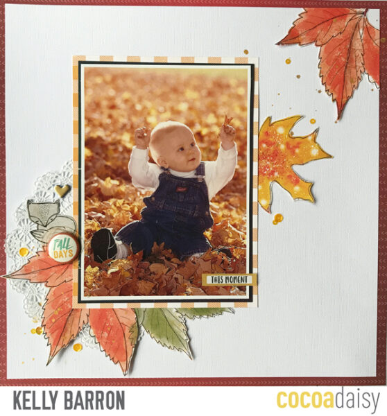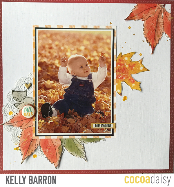 I fell in love with the fox paper and fussy cut several of them to include on my pages this month. I think that he makes an adorable accent nestled among the leaves that I scattered across the page.