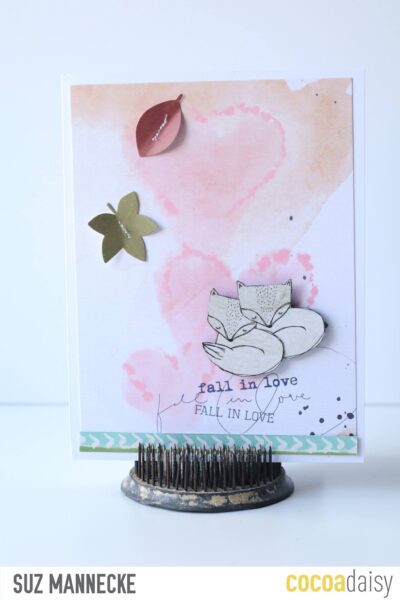 Suz fussy cut a couple of the foxes and nestled them together on top of the heart to make this darling card.