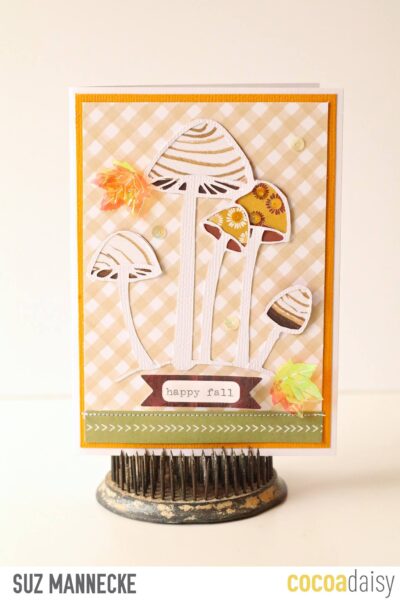 Backing cut files with patterned paper is always a great idea! Suz cut out the exclusive mushroom cut files and made this darling fall card. The sequins from SpiegelMom Scraps are the perfect embellishment.