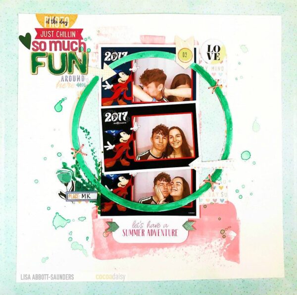 I love how Lisa stitched the big circle! Here is what Lisa said: “I love a sketch. I always see a sketch as a starting point. I used a set of 3 photos instead of the 1 square in the centre and I added a circle around the outside. My little cluster on the top left replaces the bunting on the right and that big splodge on the sketch I splashed around some paint after I’d painted my alphas and my circle.”