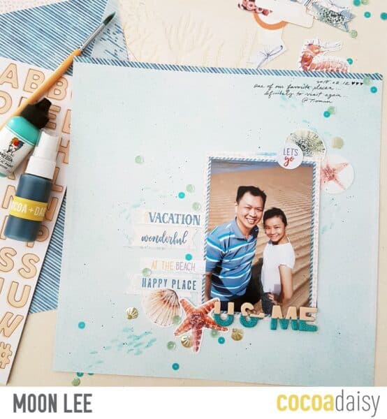 Moon Lee did a thin stripe and jounaling instead of the banner. I love how she tucked an extra photo behind her main picture. Also, notice how she altered the alphas with ink.