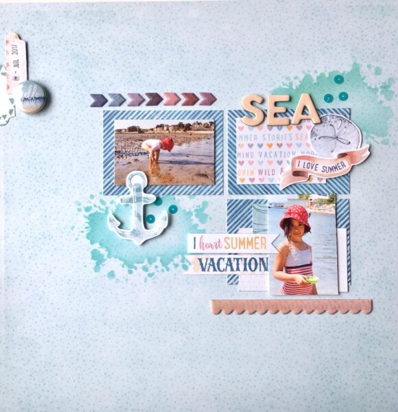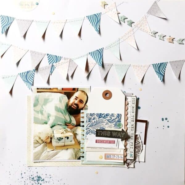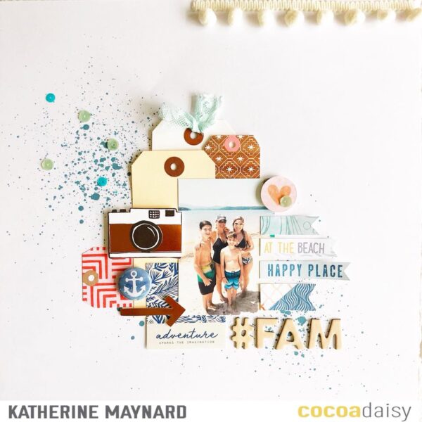 Here is my take on the sketch. I love tags…I think I add them on almost every layout! Lol! I love to add journaling or more pictures on the tags. I also used the Pom Pom fringe just like Marie.