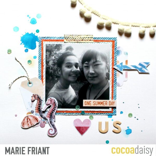 I love how Marie used the Pom Pom fringe up at the top! (Great minds think alike…you’ll see how I added it to my layout as well! 😉 ) The bit of washi tape was perfect to finish framing out her photo.