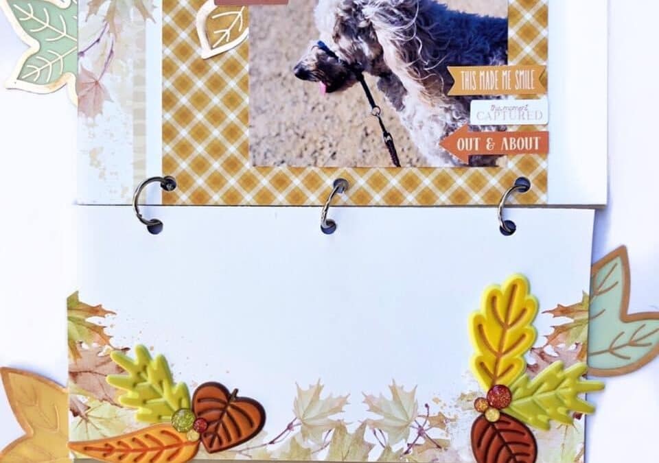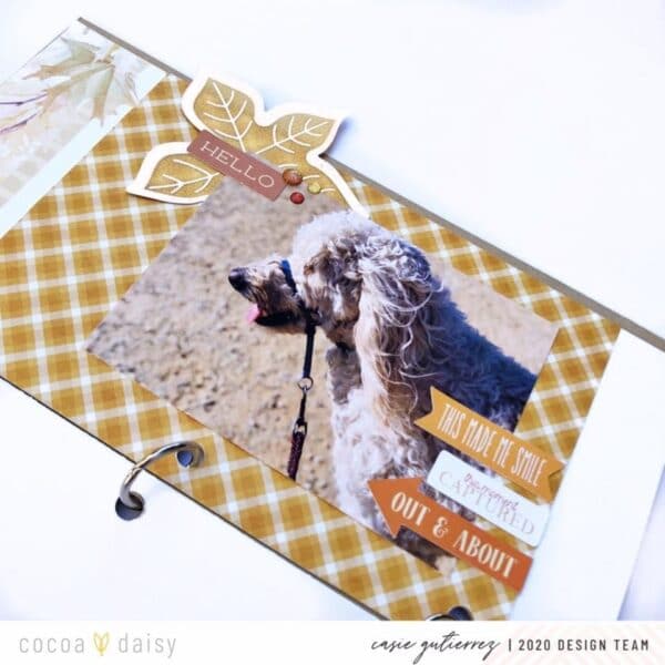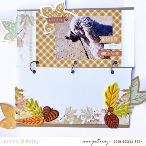 “Instead, I added a few of the puffy leaf stickers to further emphasize the beautiful leaf design on the dori page. The other side a photo I took of my dog when we were hiking. His ears were blowing in the breeze and it was a perfect capture of what fall means to me – cooler weather and being outside more!”