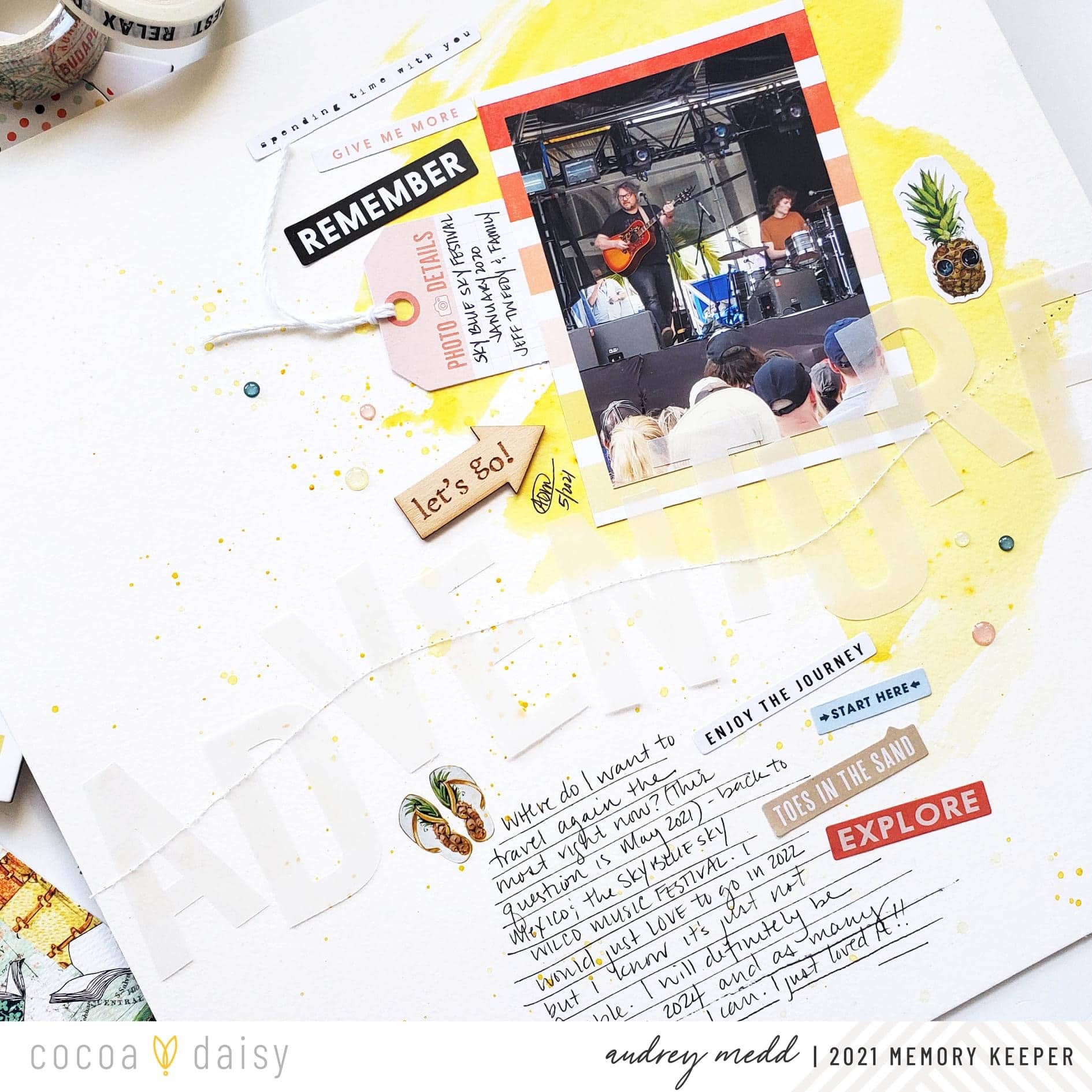 This layout is fairly simple, I started by painting a yellow background with some paint from my stash and backing a photo of my last trip to Mexico with some of the beautiful papers from the My Escape Modern Memory Keeping Kit.