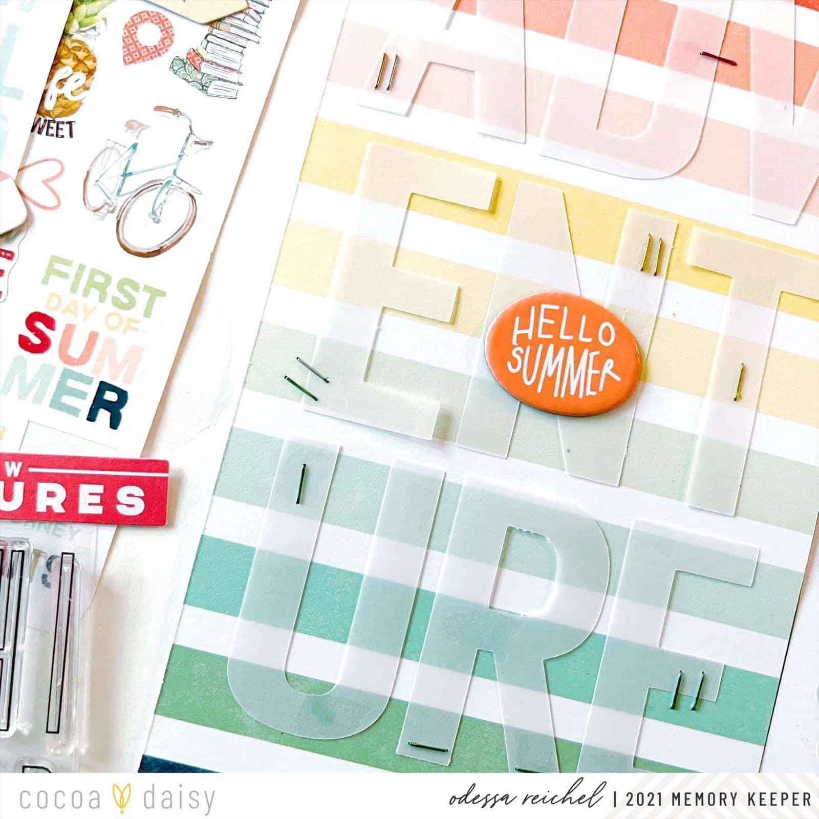 Finally, I embellished the page by running die cuts, chipboard, wood veneer, and rub-ons from the Modern Memory Keeping Kit in a line down the page. I journaled with my absolutely favorite pen from the My Escape Planner Kit and scattered some enamel dots around the page. Cheers friends!”