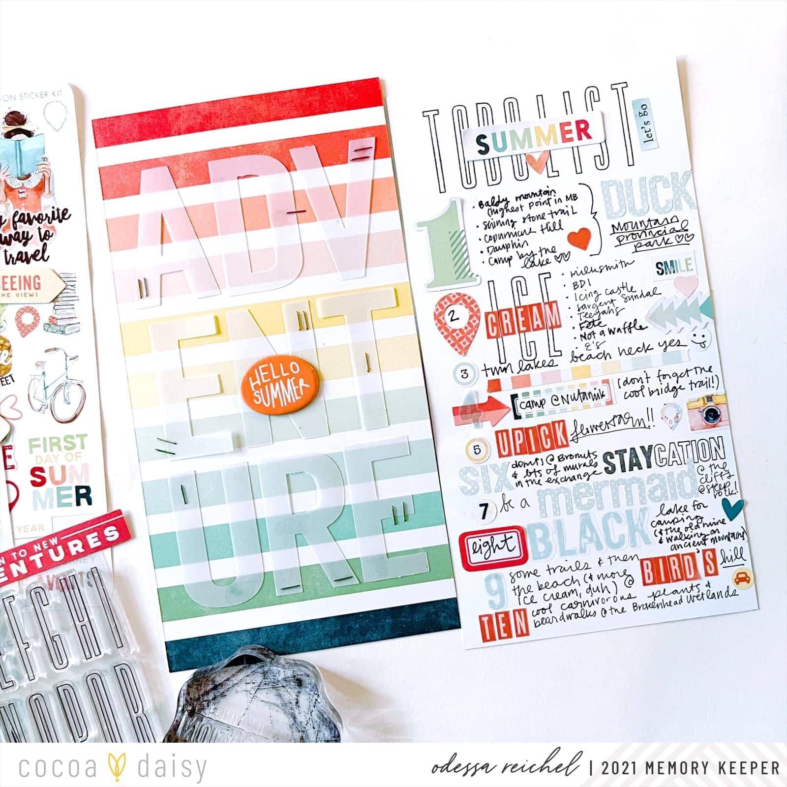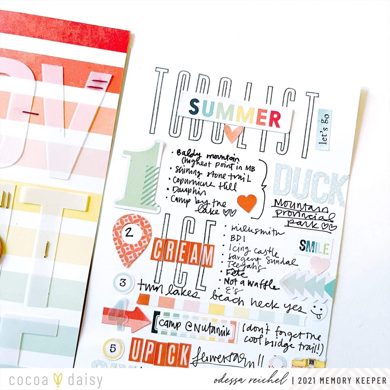 The other side is a little busy and a lot of fun. I’m still obsessed with the alpha stamp from the Travelers Notebook Memory Keeping Kit so I used that for a list title with a die-cut from the kit on top. Then I used various number stickers and die cuts as well as alpha stickers, all from the My Escape Memory Keeping Sticker Kit, to number my list. I filled it in with all my summer musts this year using pen, stickers, stamps, die cuts, and more. For most of the list items, I create a focal point with labels, alpha stickers, and so on to bring attention to the most important part and then worked around it. It’s a little chaotic but that’s how my lists roll! This list feels like the start of a summer fun album!”