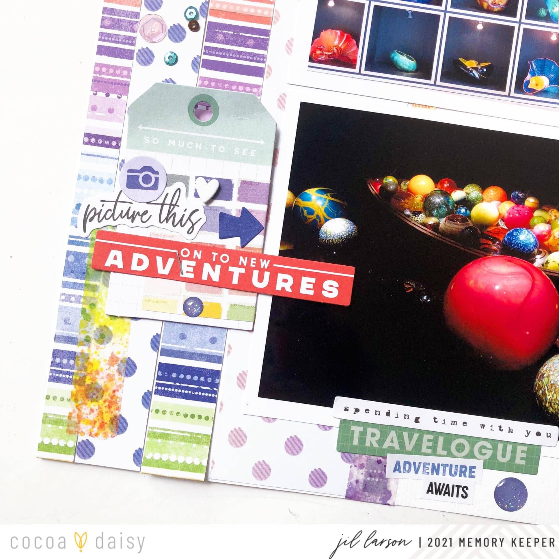 I pulled out the red in the photos with puffy alpha stickers from an earlier kit and the travel die cuts I had left from last month’s My Escape Collection. The cute little cameras helped me tell the story of just how much we enjoyed snapping photos of Chihuly’s vibrant glass sculptures. From the puffy white words, I chose “trip” and the three hearts, which I nestled in my embellishment clusters.