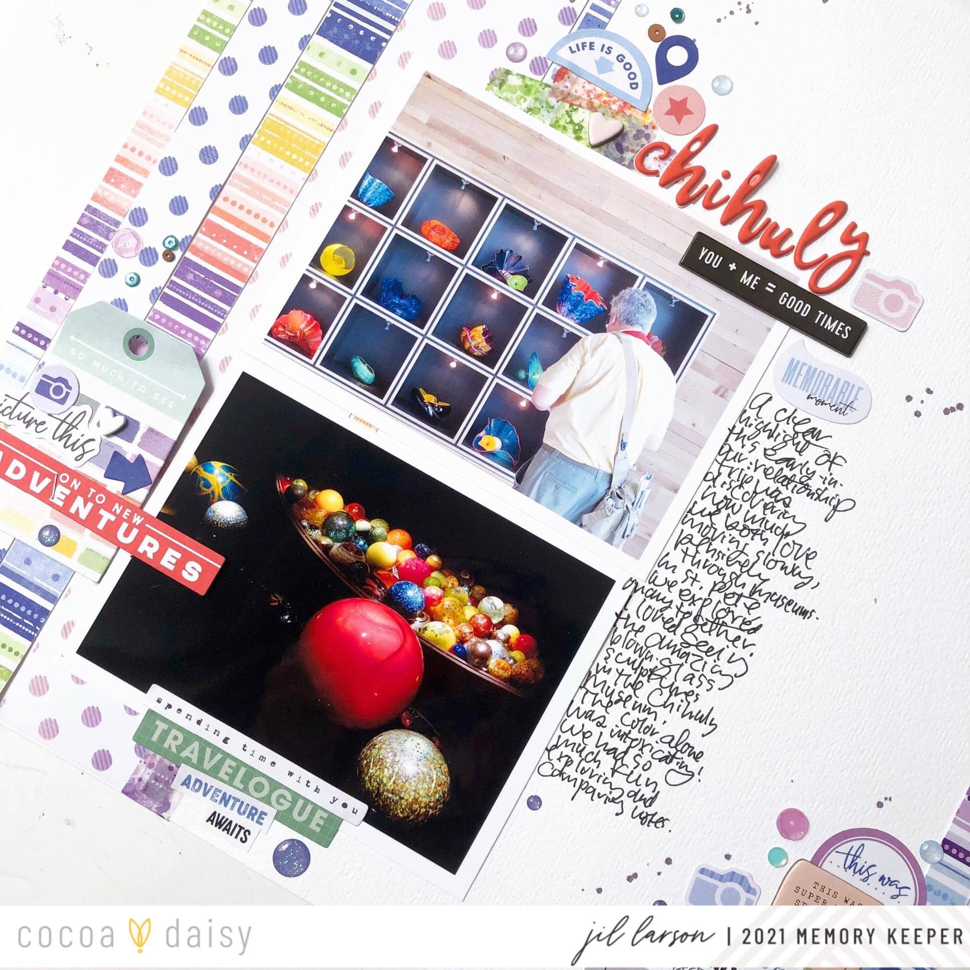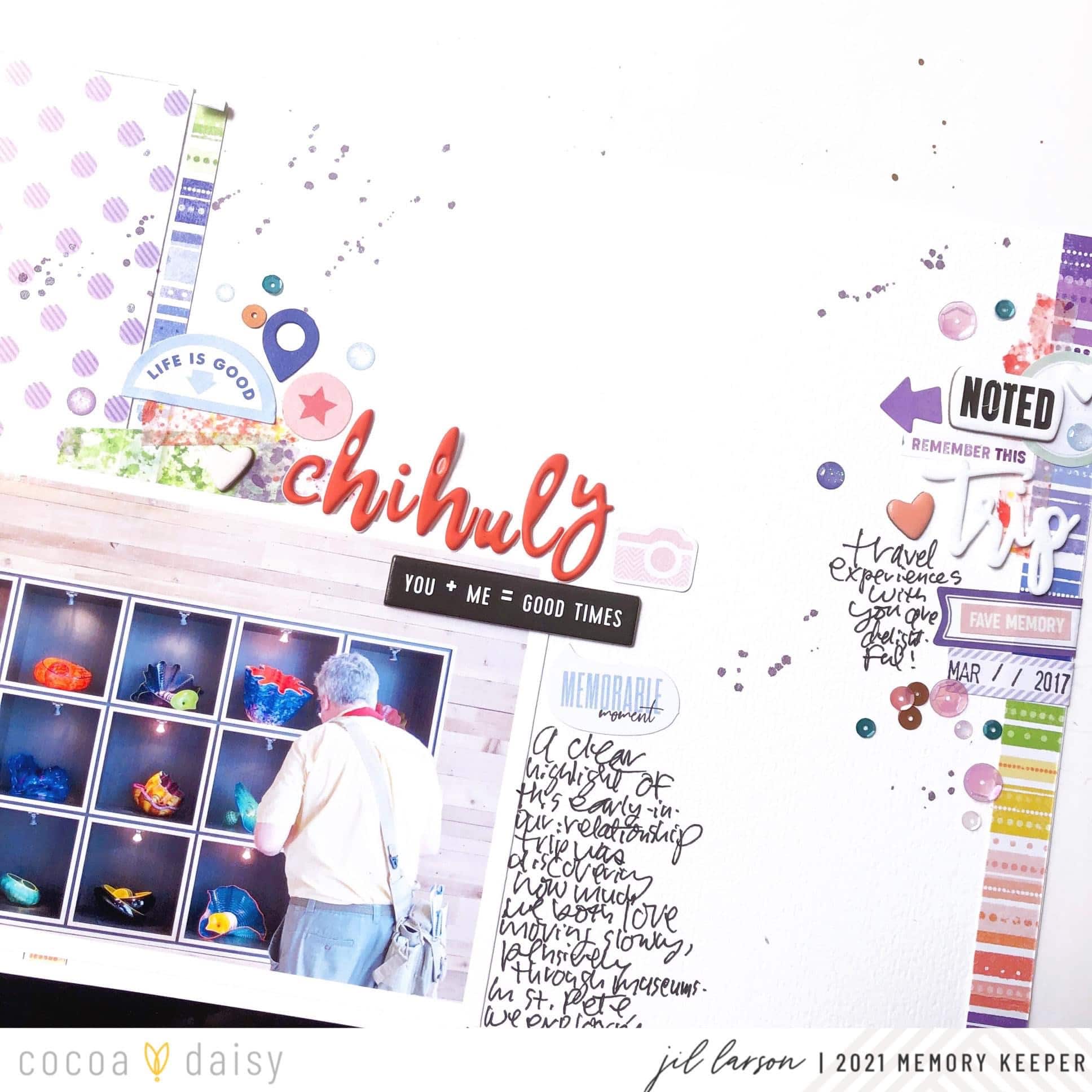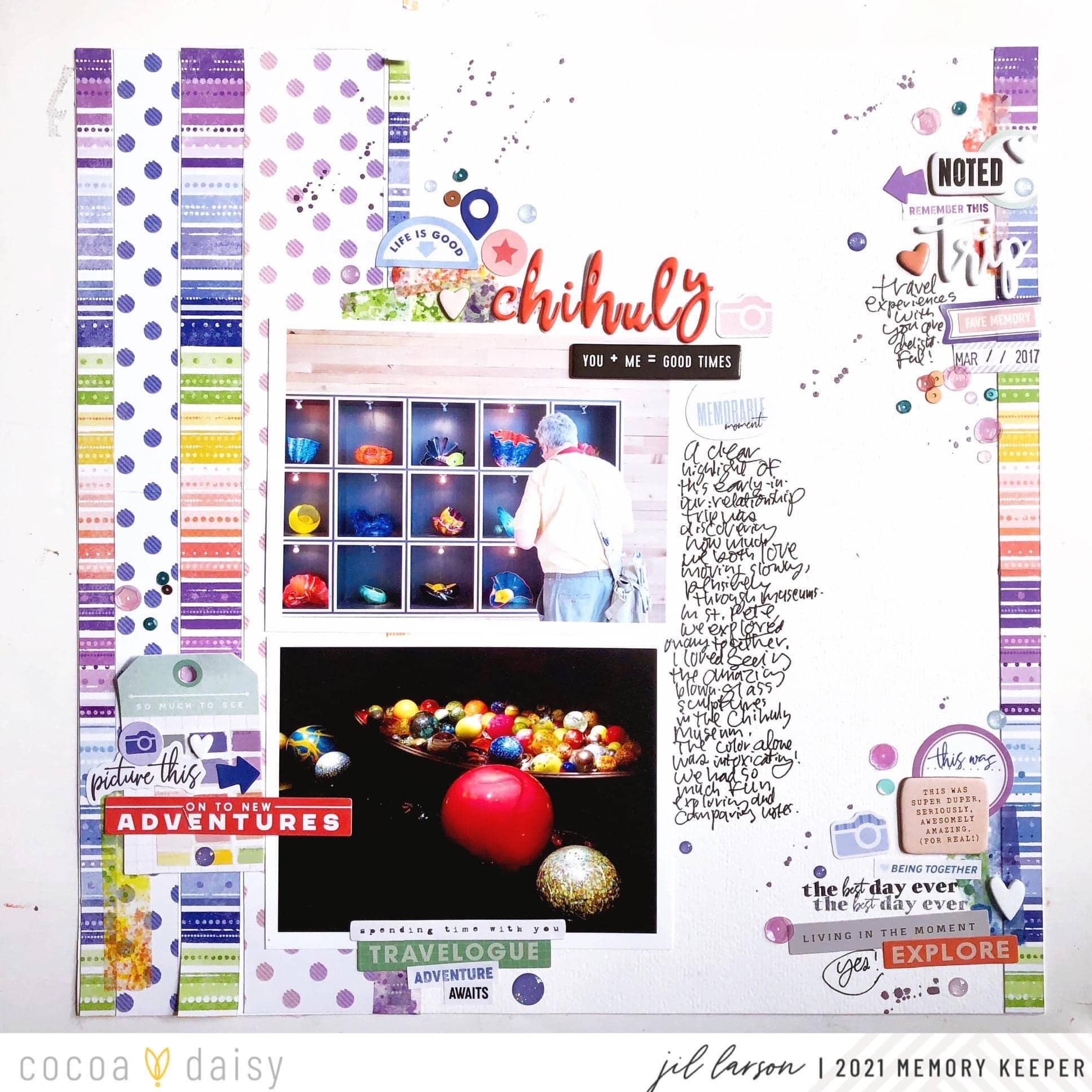 “When I saw the papers in the Wisteria Lane Collection, I knew I wanted to use them to tell the story of visiting the Chihuly museum of glass art in St. Petersburg, Florida, with my boyfriend a few years ago. The stamp set’s “best day ever” really fit this page because it was a super happy day, so much fun to look back on! I wanted to convey this delight with plenty of small embellishments and confetti of glitter dots and sequins.