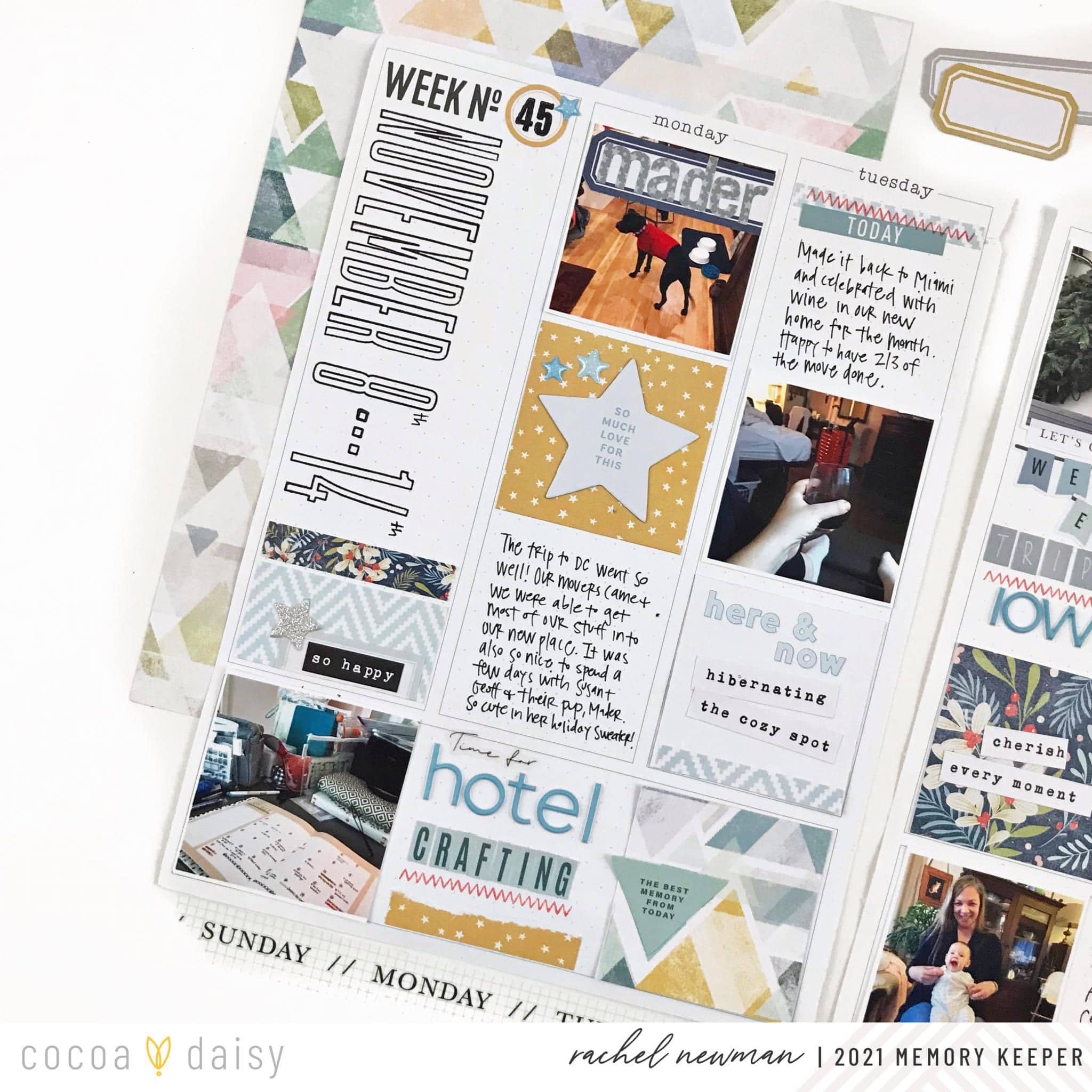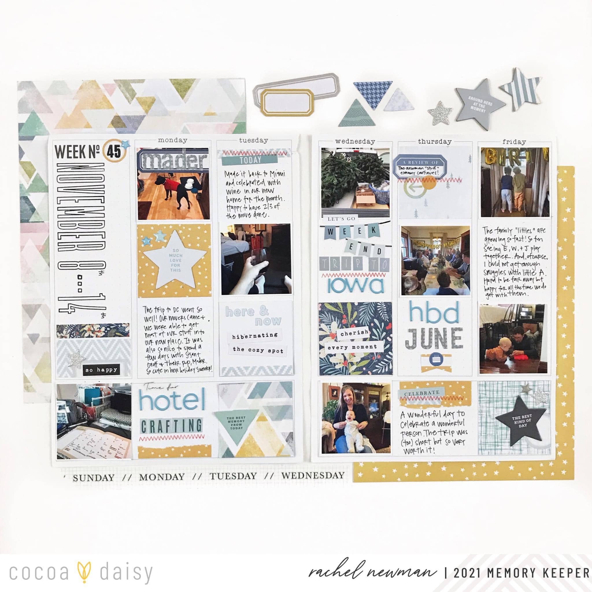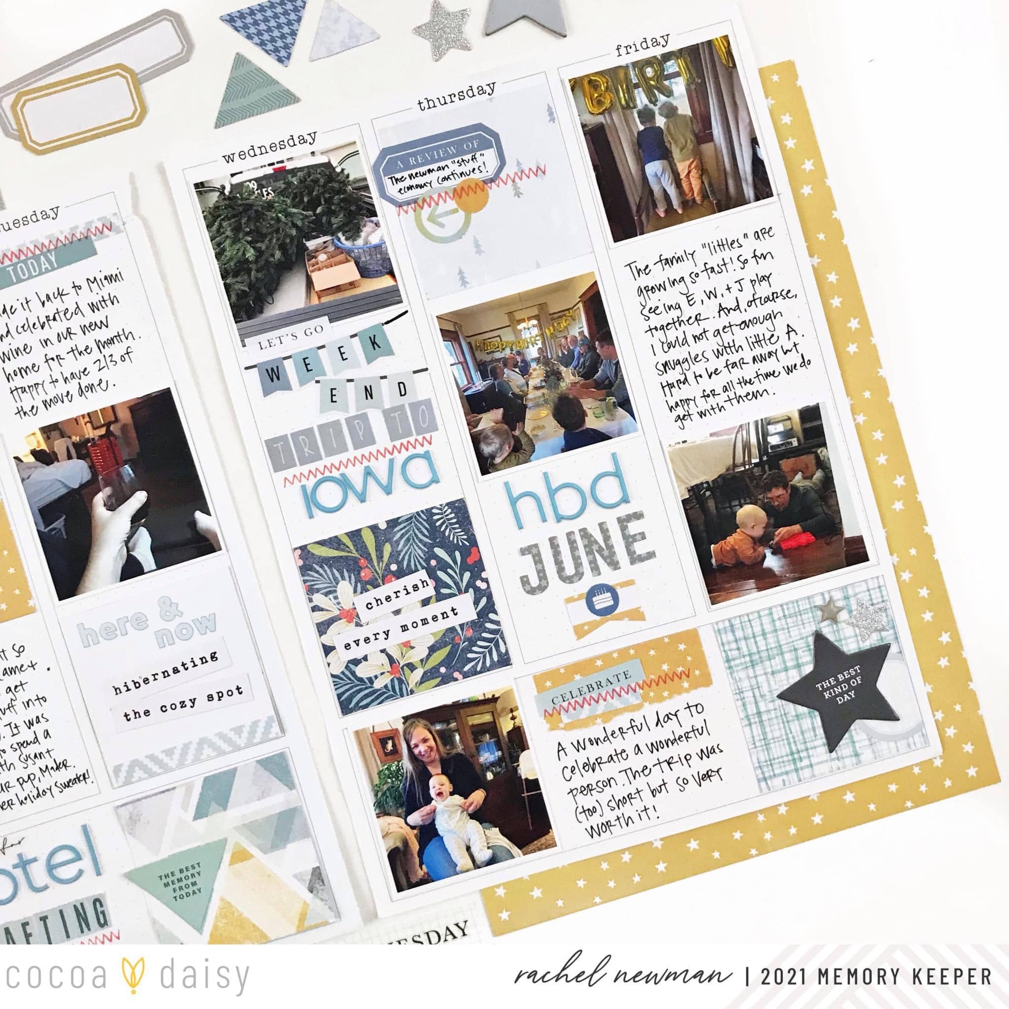 My strategy is to try and have three grid elements for each day of the week: a photo, a decorative square, and a journaling spot. This becomes the foundation of the page and takes the guesswork out of what should go where. Next, I pull embellishments like the stars, labels, alphas, and stickers from the same kit to embellish the grid squares. I love to add journaling with a mix of alphas, almost creating a title for the day.