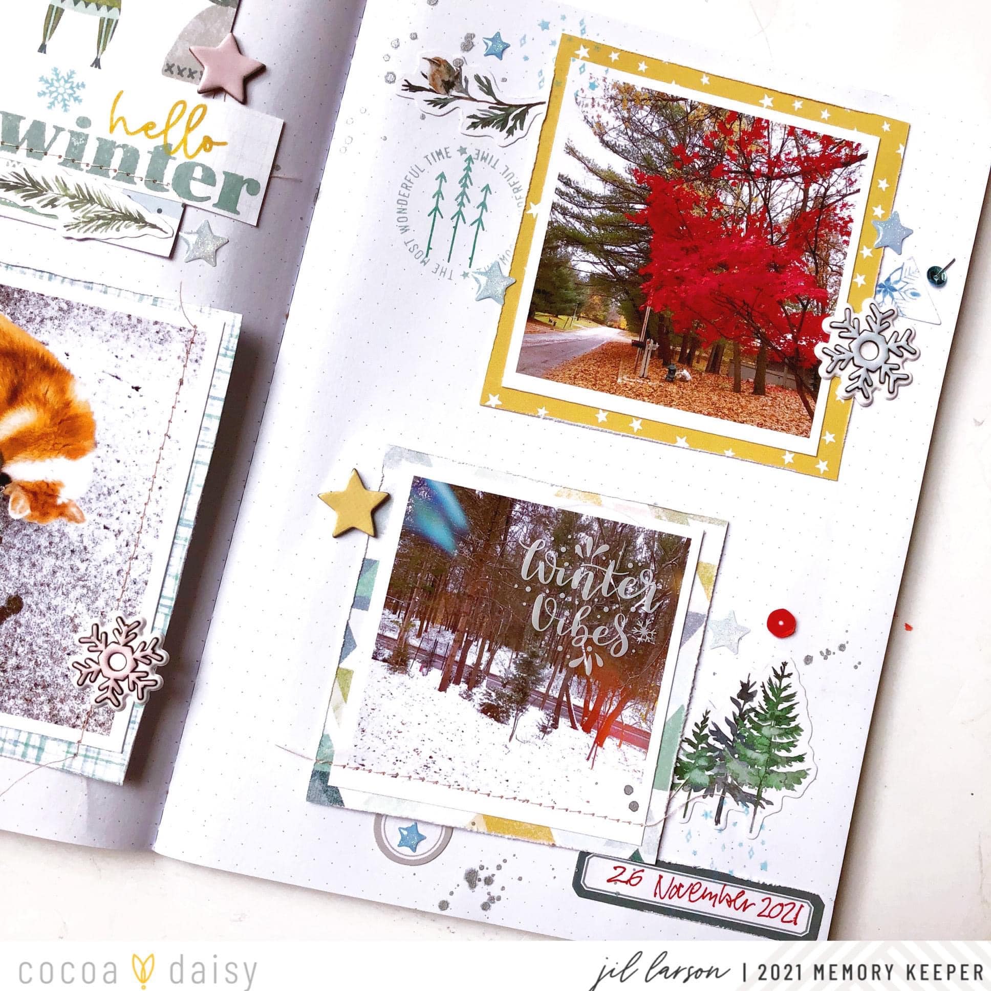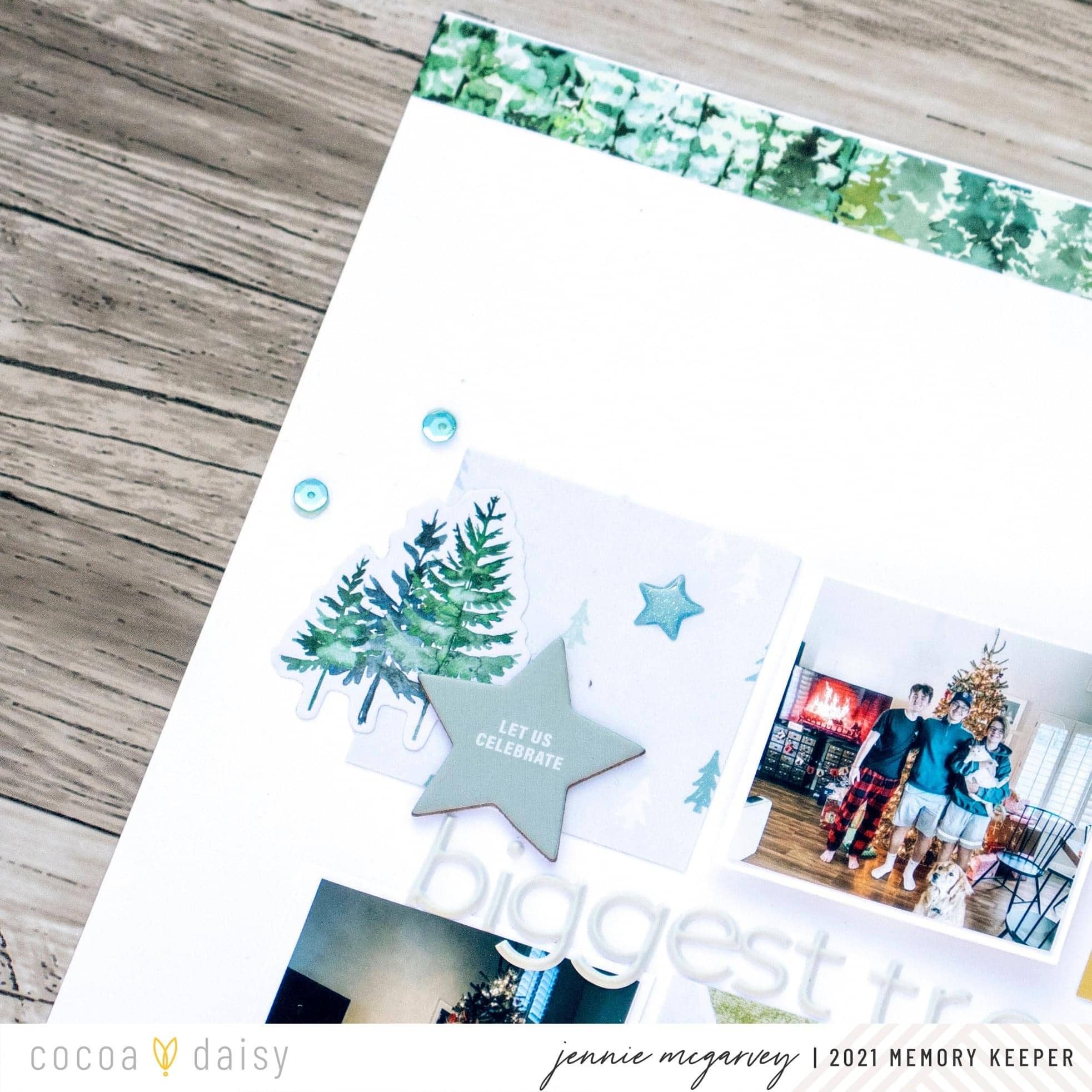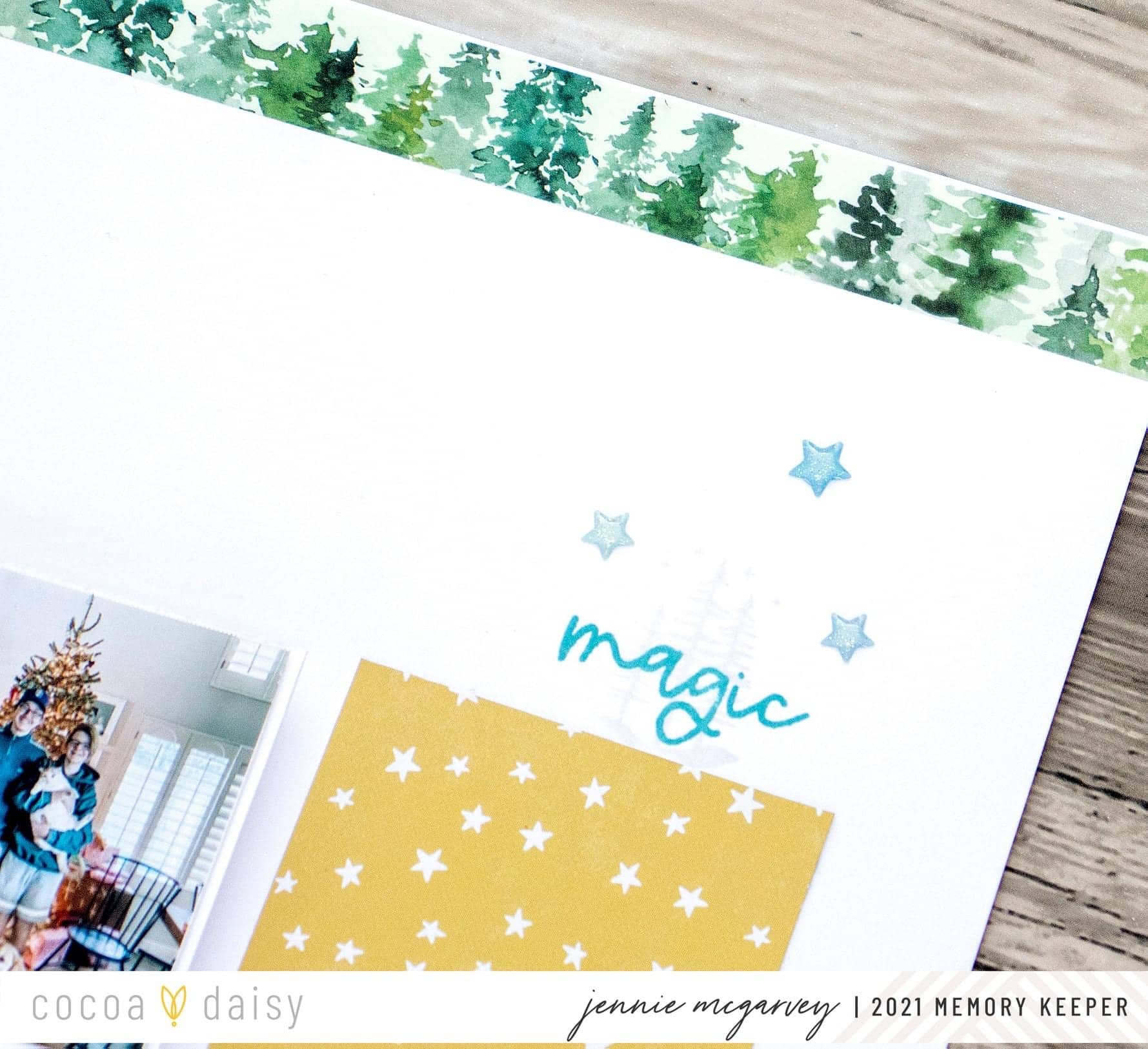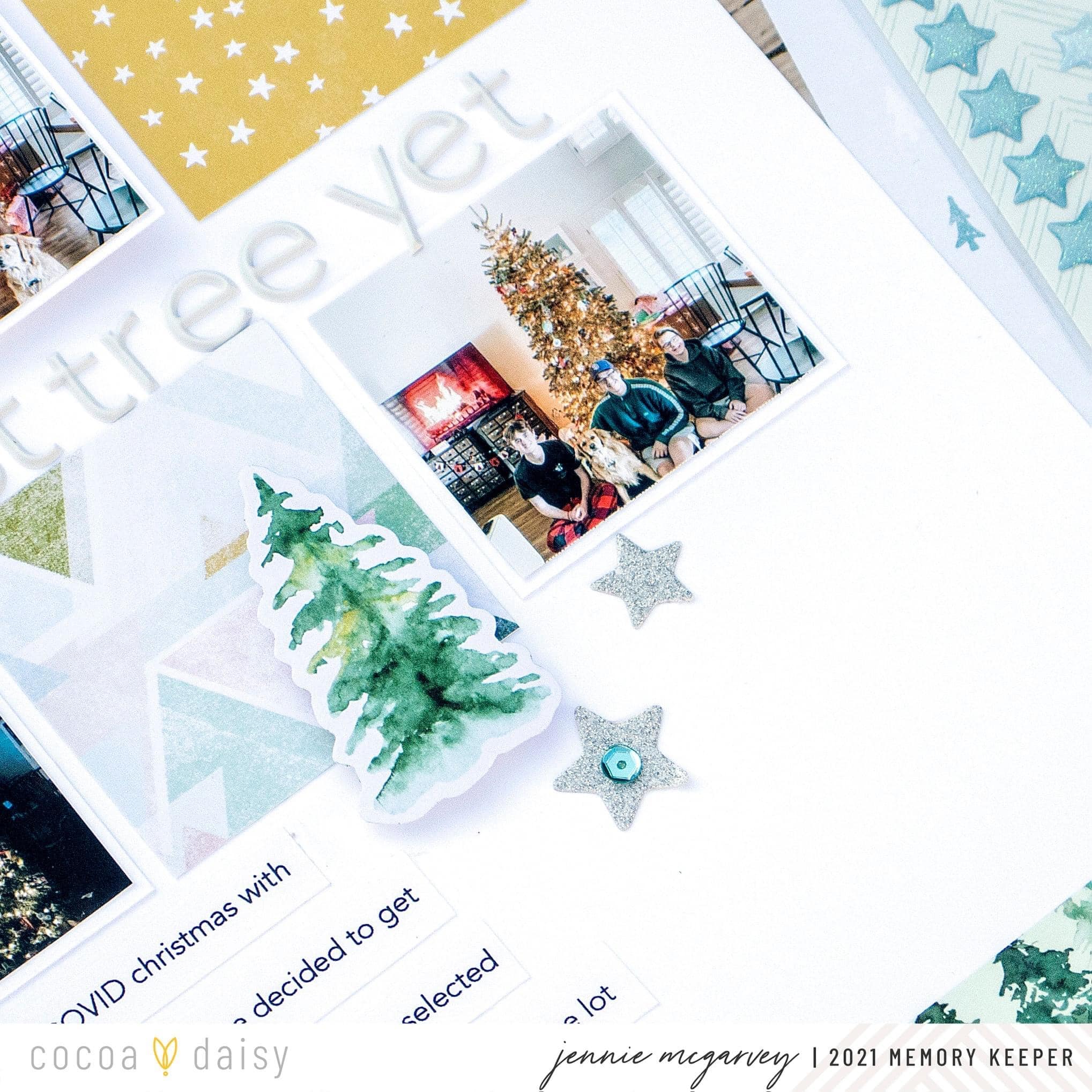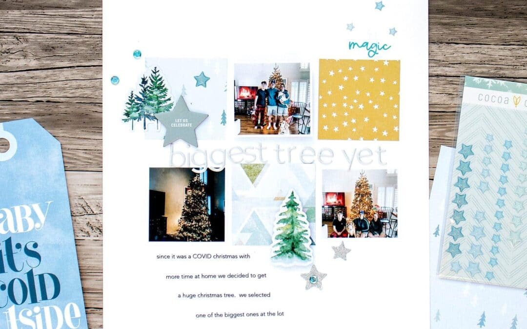 Grids are my absolute favorite! I think that it’s the most fun and easy way to create any project. I had a lot of fun using the fun tree elements from the Winter Twilight Modern Memory Keeping Kit and the Winter Twilight Classified: Planner Kit to document our huge tree! To make the grid I trimmed papers from the Winter Twilight Modern Memory Keeping Kit into squares and laid out the photos and paper squares to create a visual triangle.