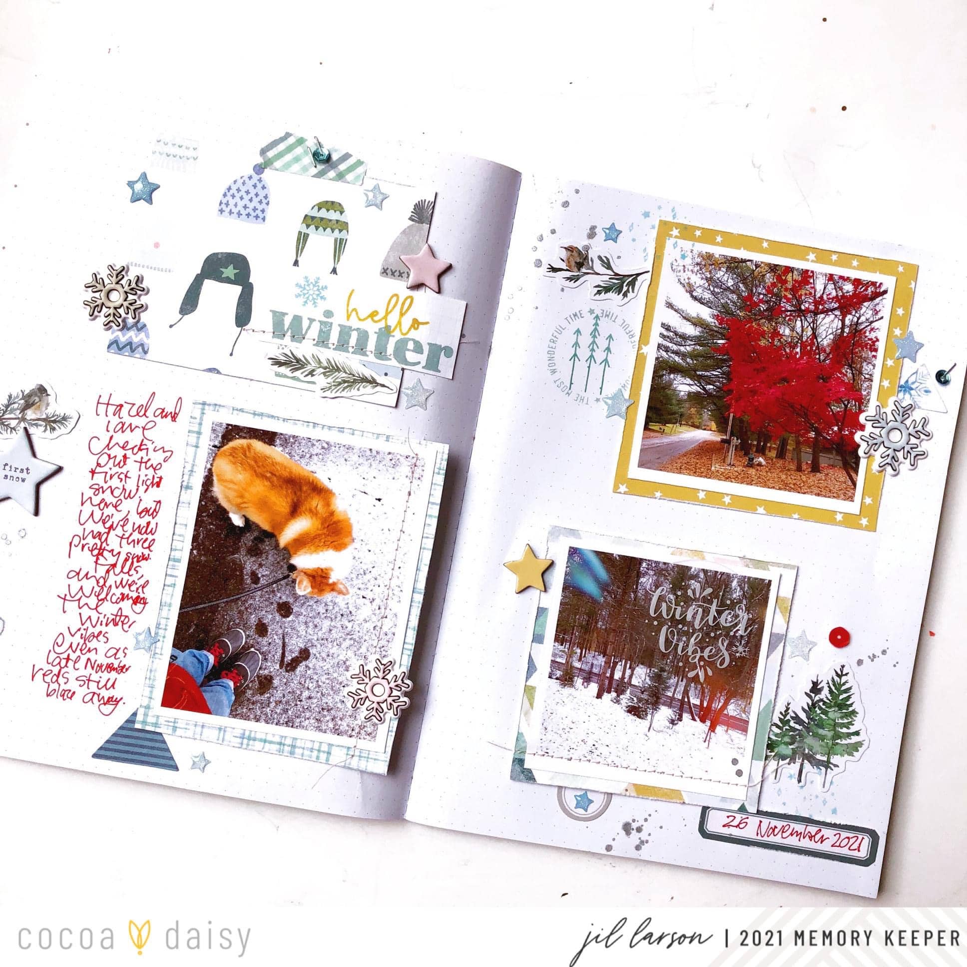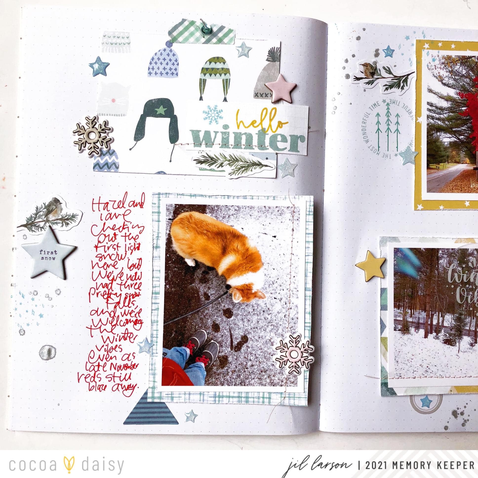 Winter has come early! I captured this story in a loose grid spread in my December notebook, and the Winter Twilight Collection offered the perfect papers and details to catch that winter vibe. I love creating a grid with three matted photos and one block for the title. I made the title block with the winter cap paper and the stamp set from the Winter Twilight Modern Memory Keeping Kit.