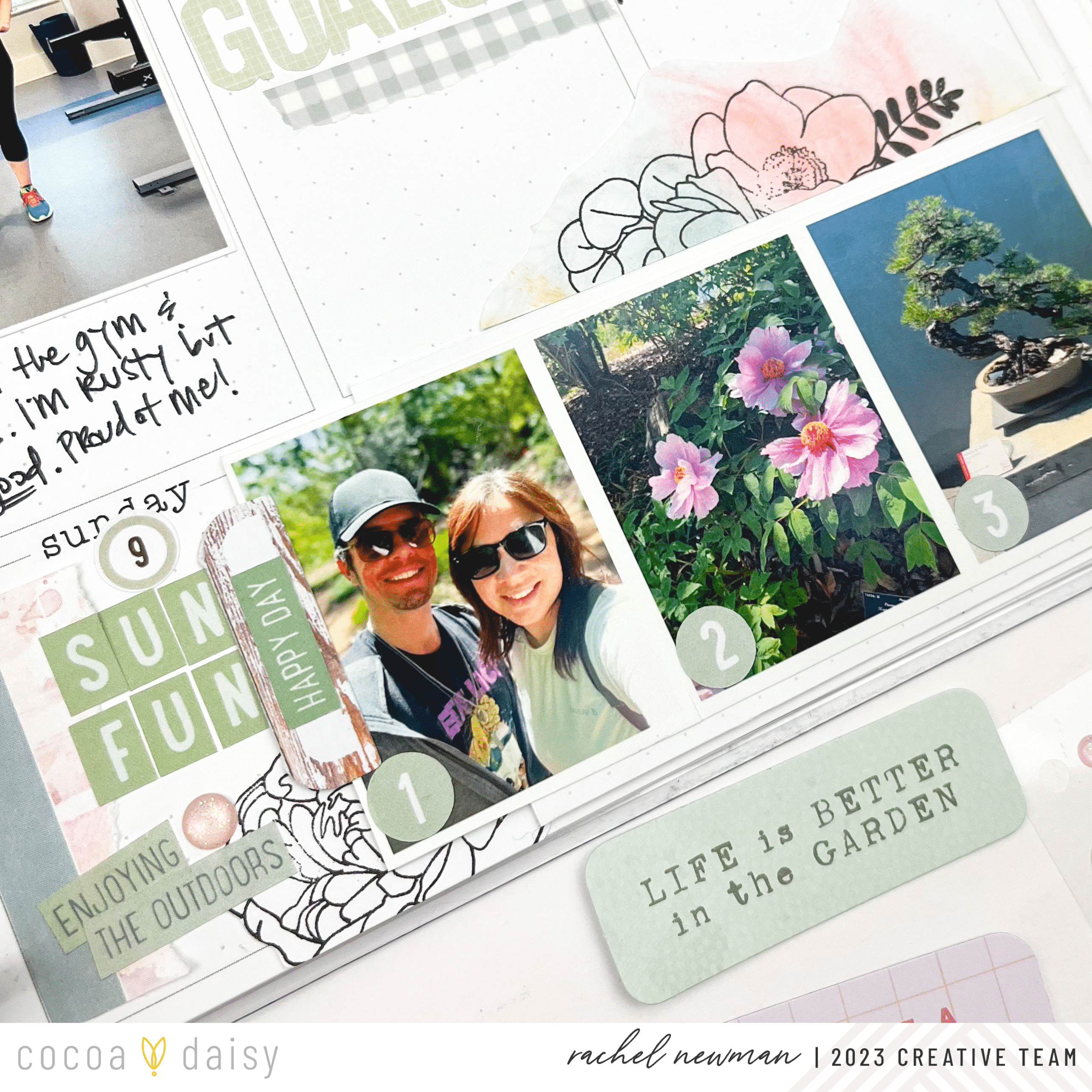 Sometimes, you have a lot of photos captured in one day. When this happens, you can always number the photos and use the number stamp with the caption for the photo. Here, I created a flip with cardstock with photos on the outside and inside. Next, I used the number stamp and the stitch stamp from the Lillian’s Garden Traveler’s Notebook Memory Keeping Kit to create my captions for each photo.