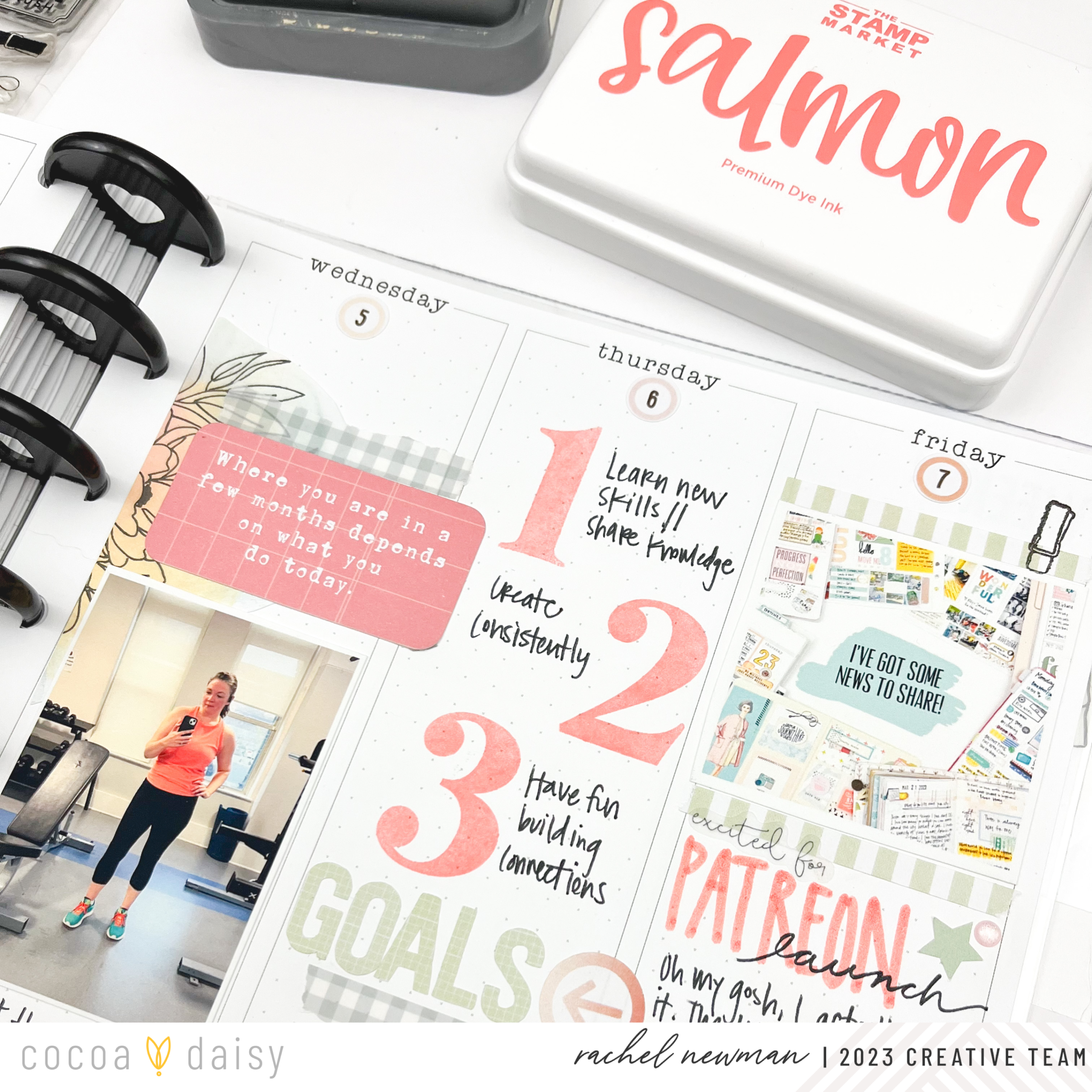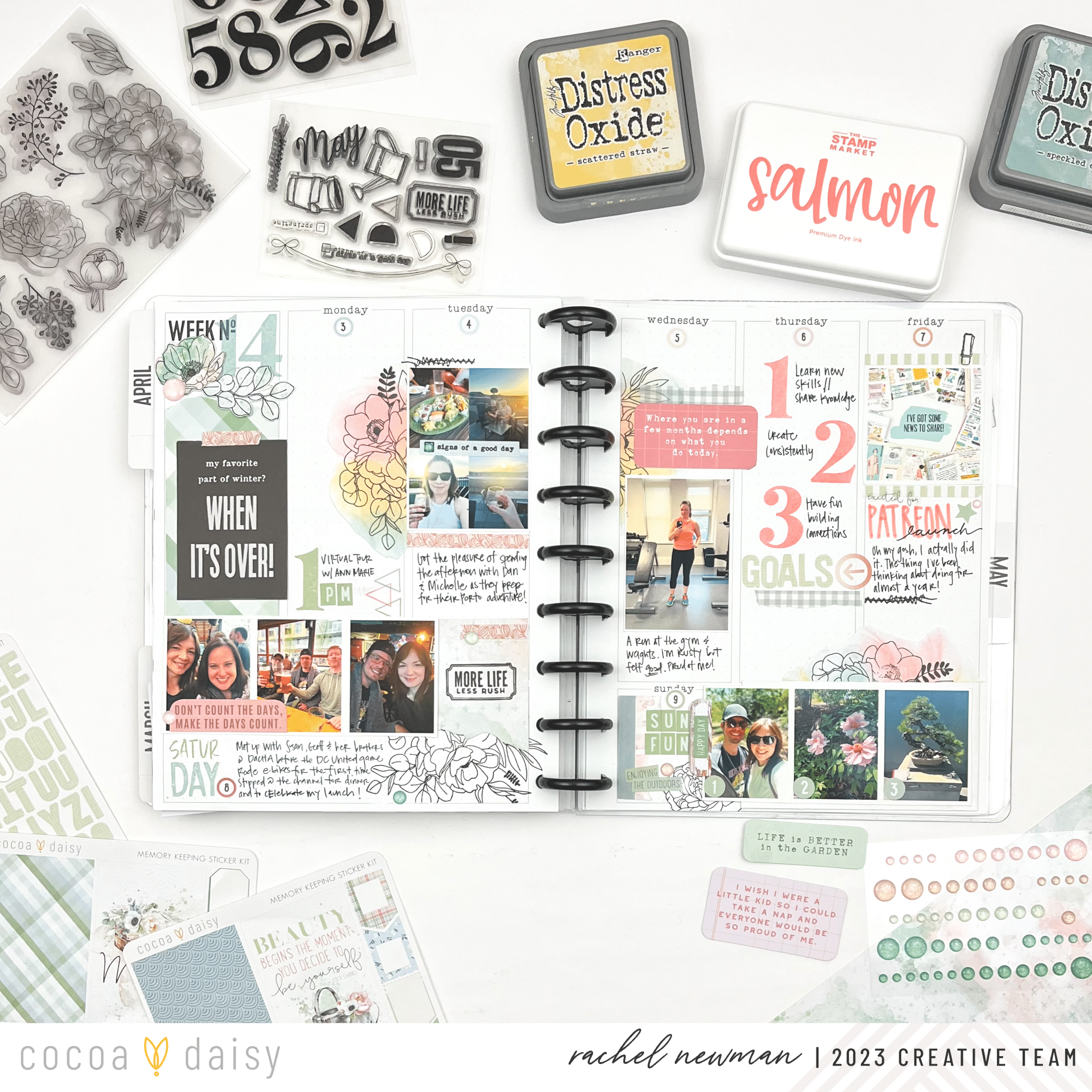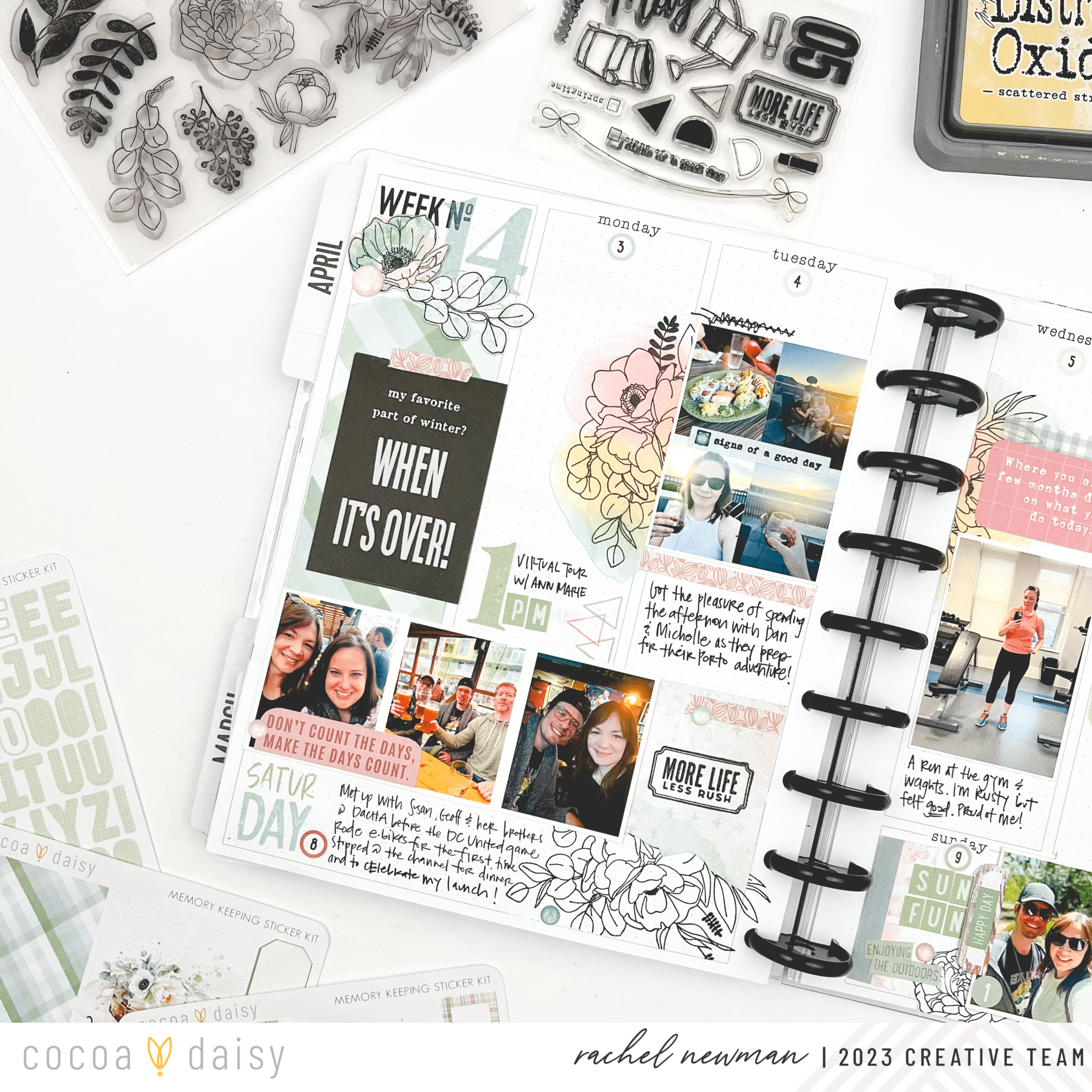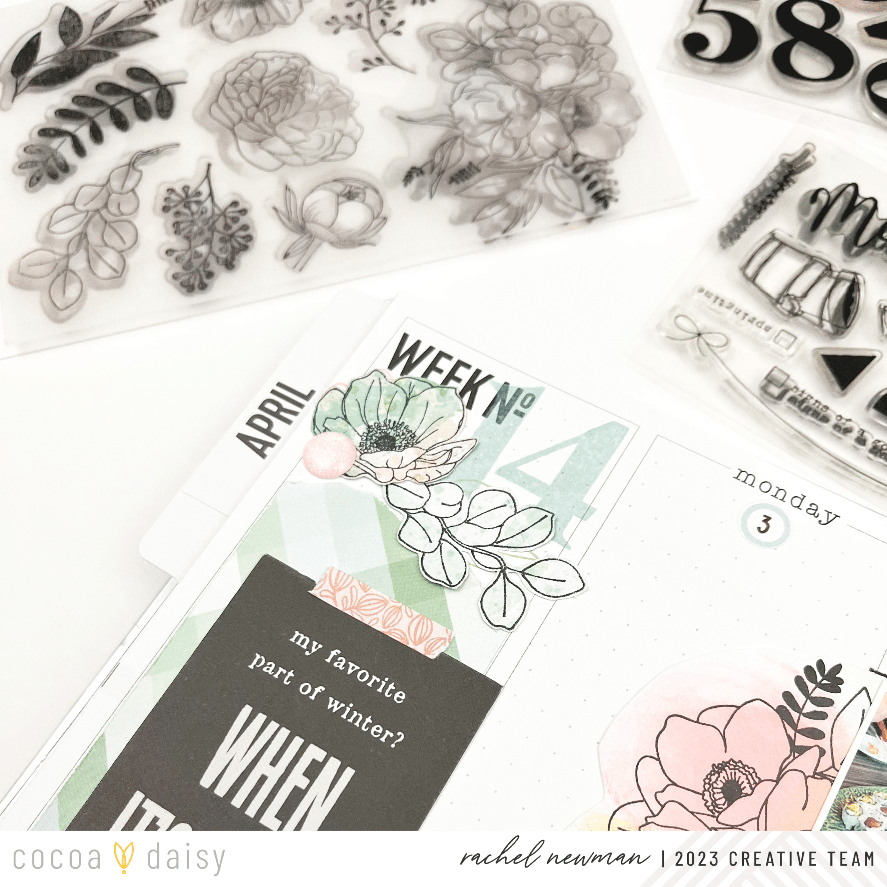 It’s helpful to know what week in the year you are on, and in the Daisy Planner, there is a space to mark this information. I decided to layer the number stamp from the Lillian’s Garden Modern Memory Keeping Kit with the preprinted “Week No.” text. The number stamp could have been used to stamp the dates, but I didn’t want the spread to feel too crowded, so I opted for the date stickers from the Lillian’s Garden Planner Add-On Kit instead. For more stamping fun, I included the Spring Garden Stamp Set, which I stamped onto cardstock and fussy cut, creating a die cut.