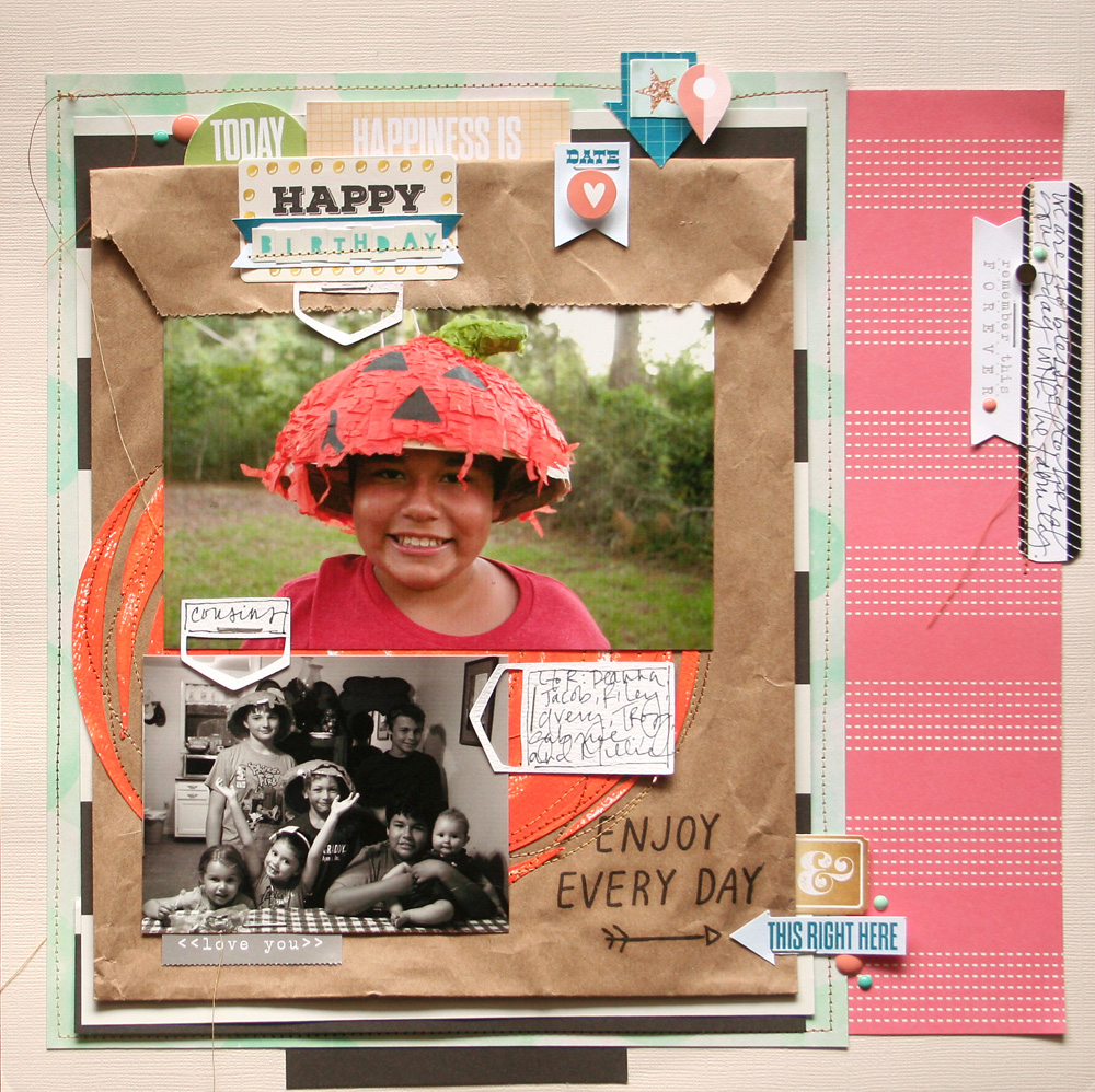 On this layout I used the negative space from a mess circle cut file to create a fun background for my photos. I simply painted it orange and stitched it to my page (a recycled stamped bag, also from my kit). The three white tabs are also from the cut files. I plan on cutting out several of these for future use. I can see myself using them again and again.