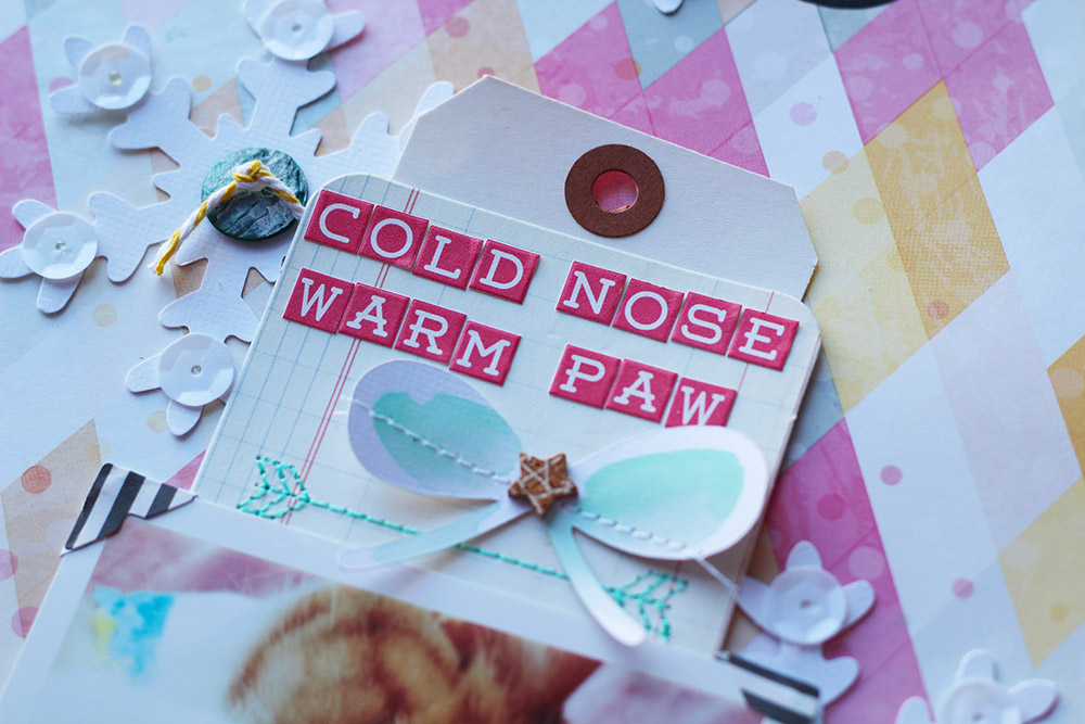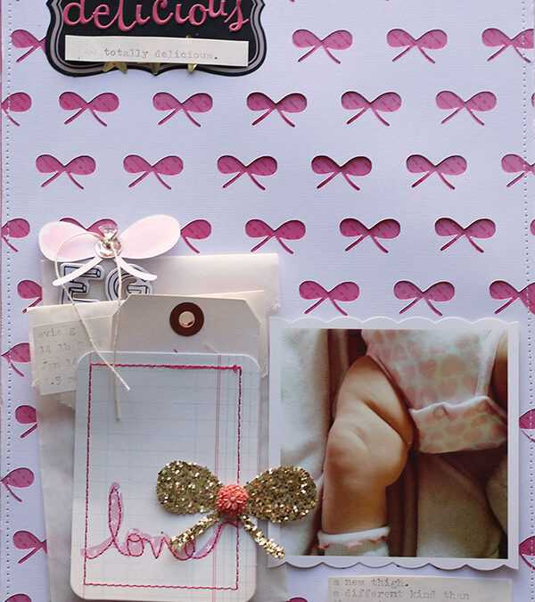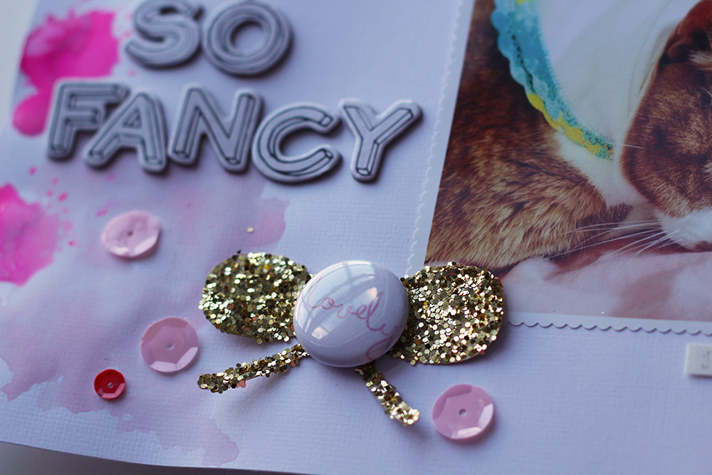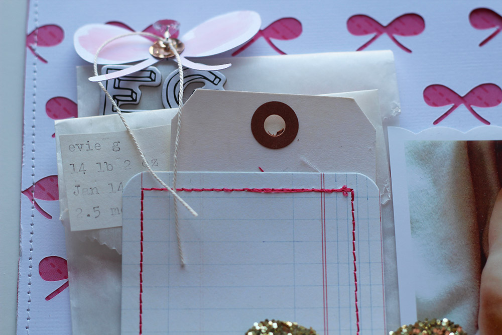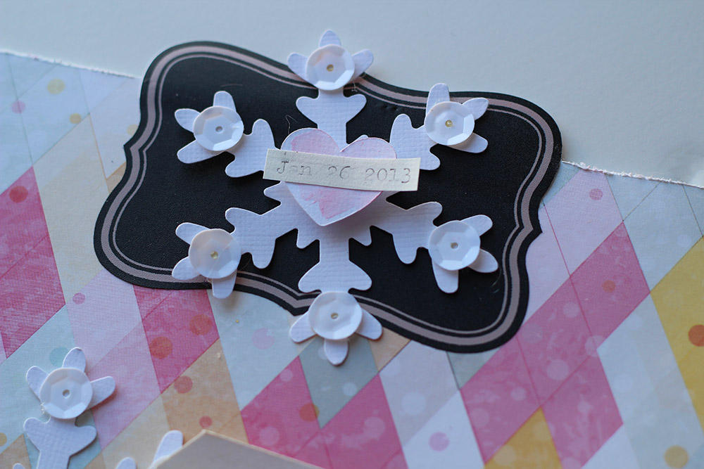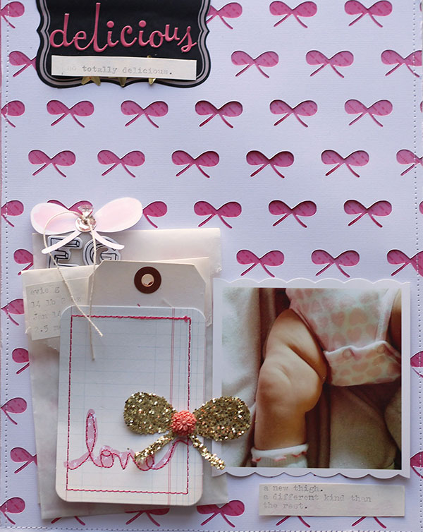 I also used the cut out bows and hearts (from the large bow background and the confetti hearts background) to make embellishments for a few pages: