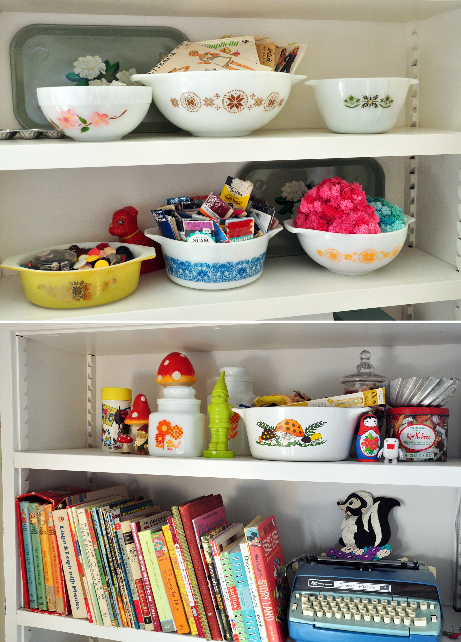 Martha, You space is beautiful! I love all of the shelving, your fabric collection, and of course, the vintage Pyrex dishes. (I have a small collection too). TFS! 🙂