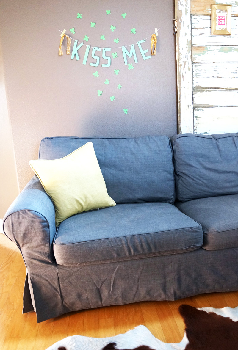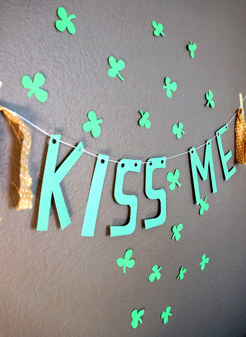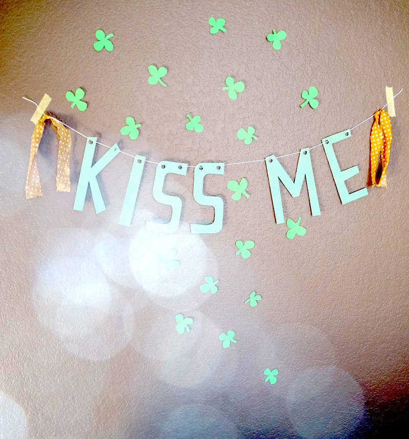 It’s a “Kiss Me” banner, surrounded by some hand cut shamrocks to add to the festivities.
