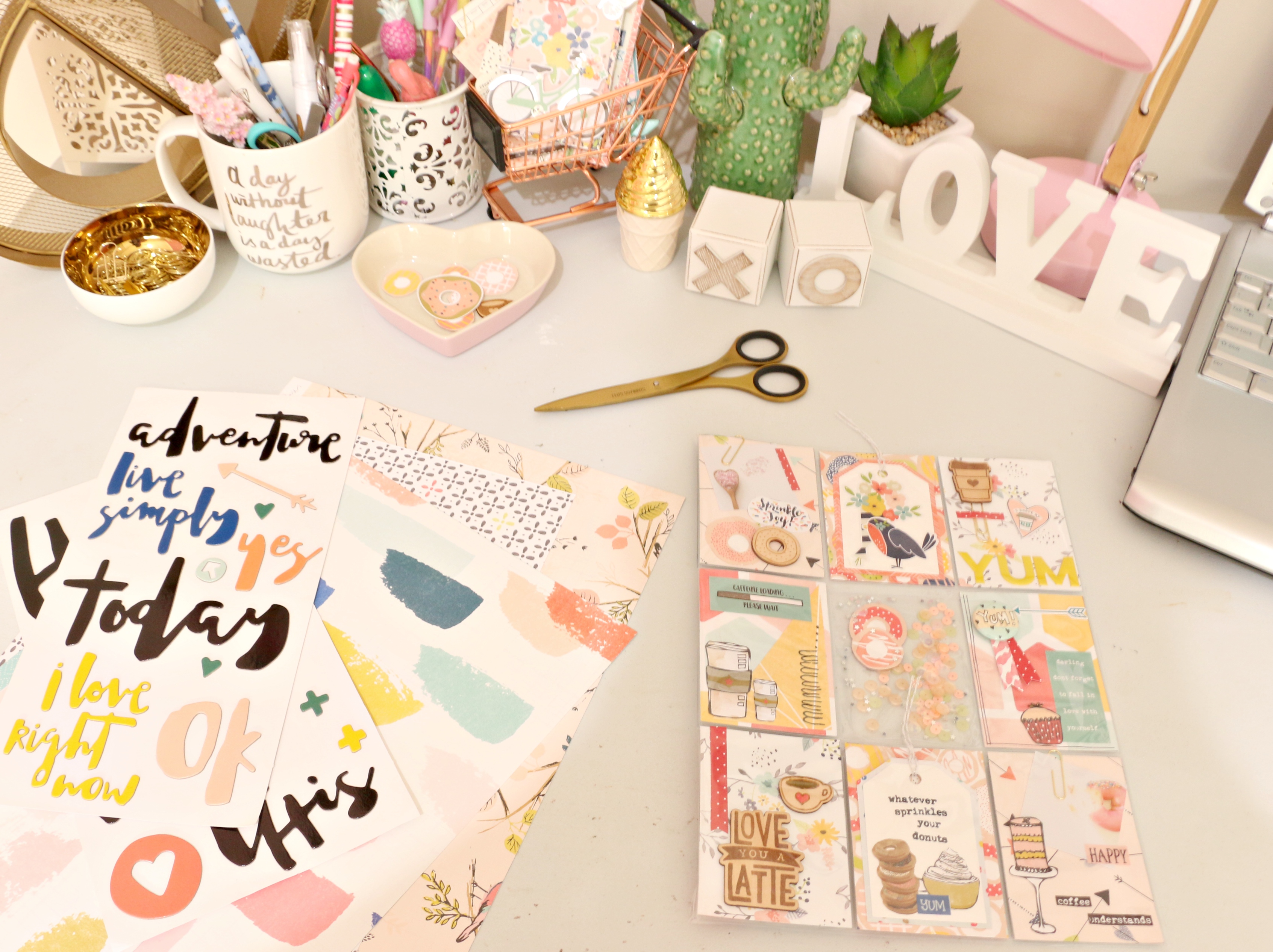 My craft space is my happy place.So I love to surround myself with my favourite items that make me happy! This month I have worked with the ‘Sprinkles’ main kit as well as the ‘Glazed’ add on paper kit. My desk has been full of beautifully co-ordinated papers in varying designs and hues.