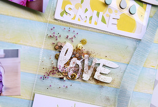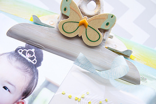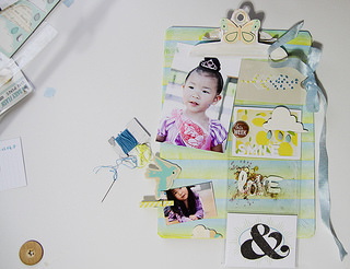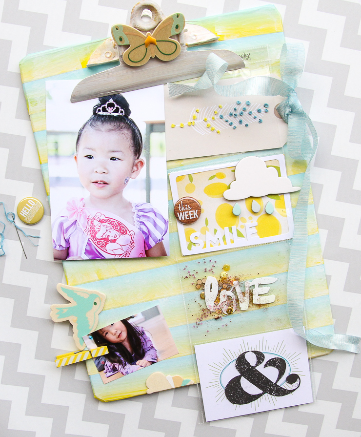10) And the Prism kit came to my rescue, the Basic Grey wood die cut butterfly covered the Office Depot logo perfectly. I also had to use a few of those all over the chipboard. I grabbed some leftover favorite photos, and used the main clip to hold the 5×7, grabbed a clothespin from my stash to clip the smaller photo at the bottom.