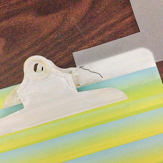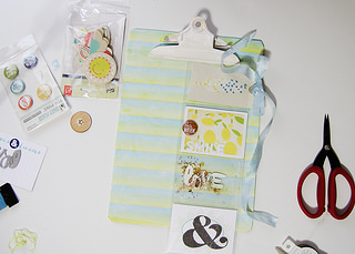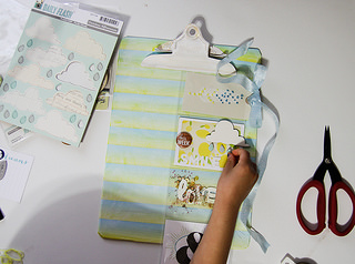 2) The clip part is just okay, now to decide what to do with the chipboard. I used the washi tape from the Dewdrop Day In the Life Add On Hint of Sunshine kit to cover it. To cover under and around the clip, I lifted the clip and got up as close to where it connects to the board. Then used a piece of vellum and marked roughly the outline of the metal piece. Then just like wallpapering, I was able to slip that end of the washi under the metal piece to fit exactly.
