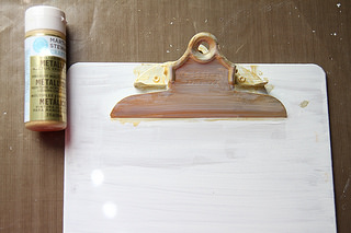 1) Wishing I still had some gold spray paint since the gold paint I have is too translucent to cover, I start to add some Gesso hoping it will help, but not really. Not sure yet how I will cover the chipboard part, but went ahead and covered in Gesso.