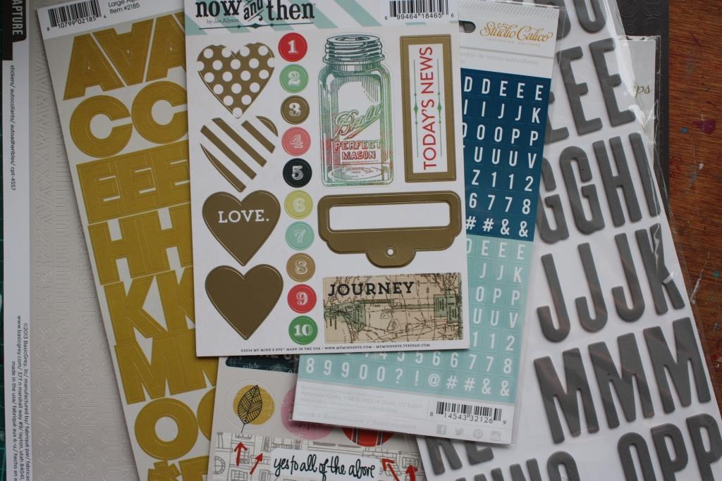 Embellishments, alphas, die cuts, paper and stickers.