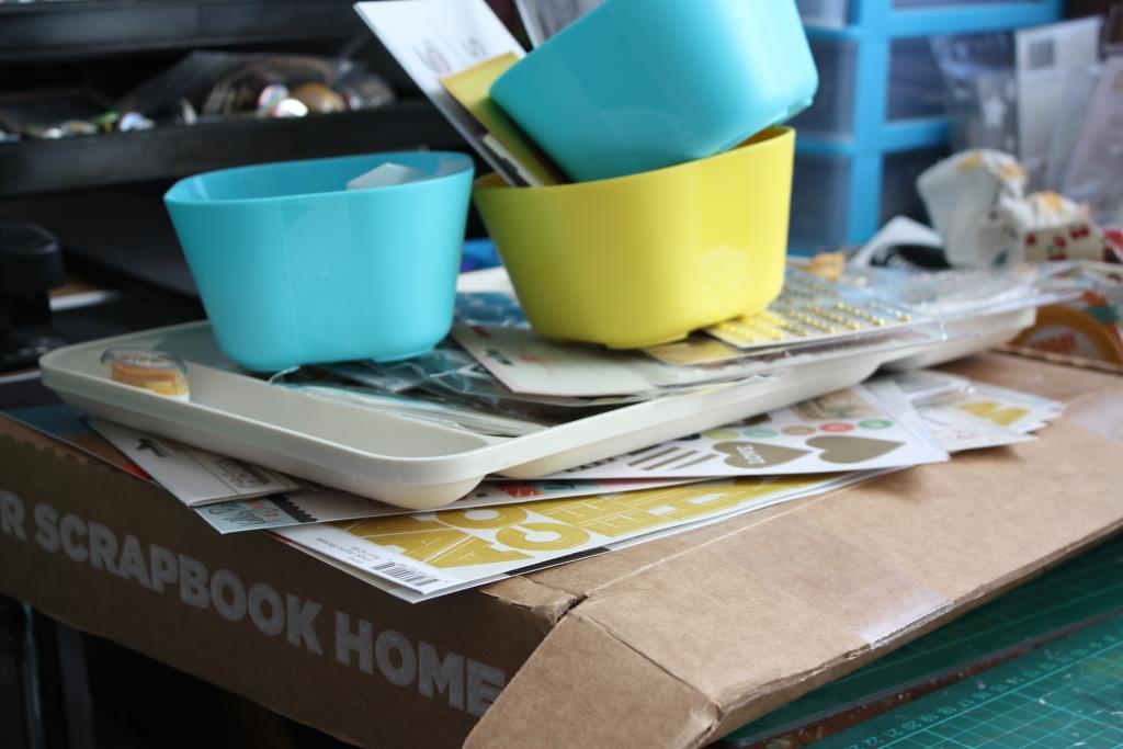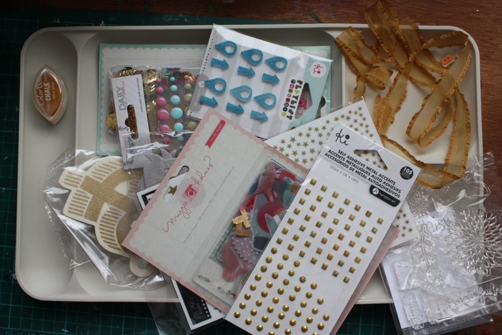 The embellishments I put in a tray (a TV dinner tray from Tupperware that my Mum found at a second hand shop).